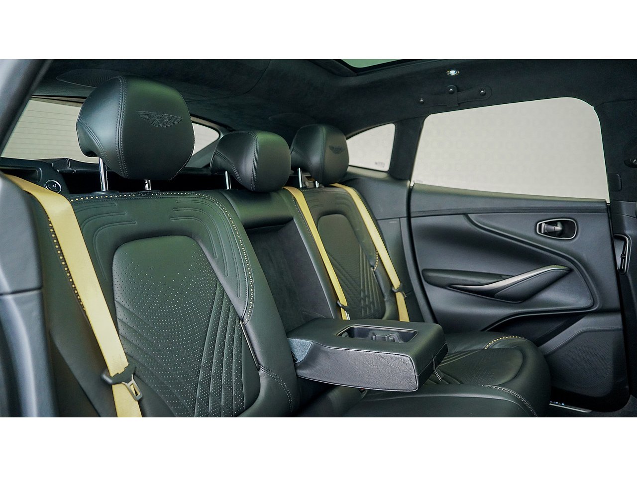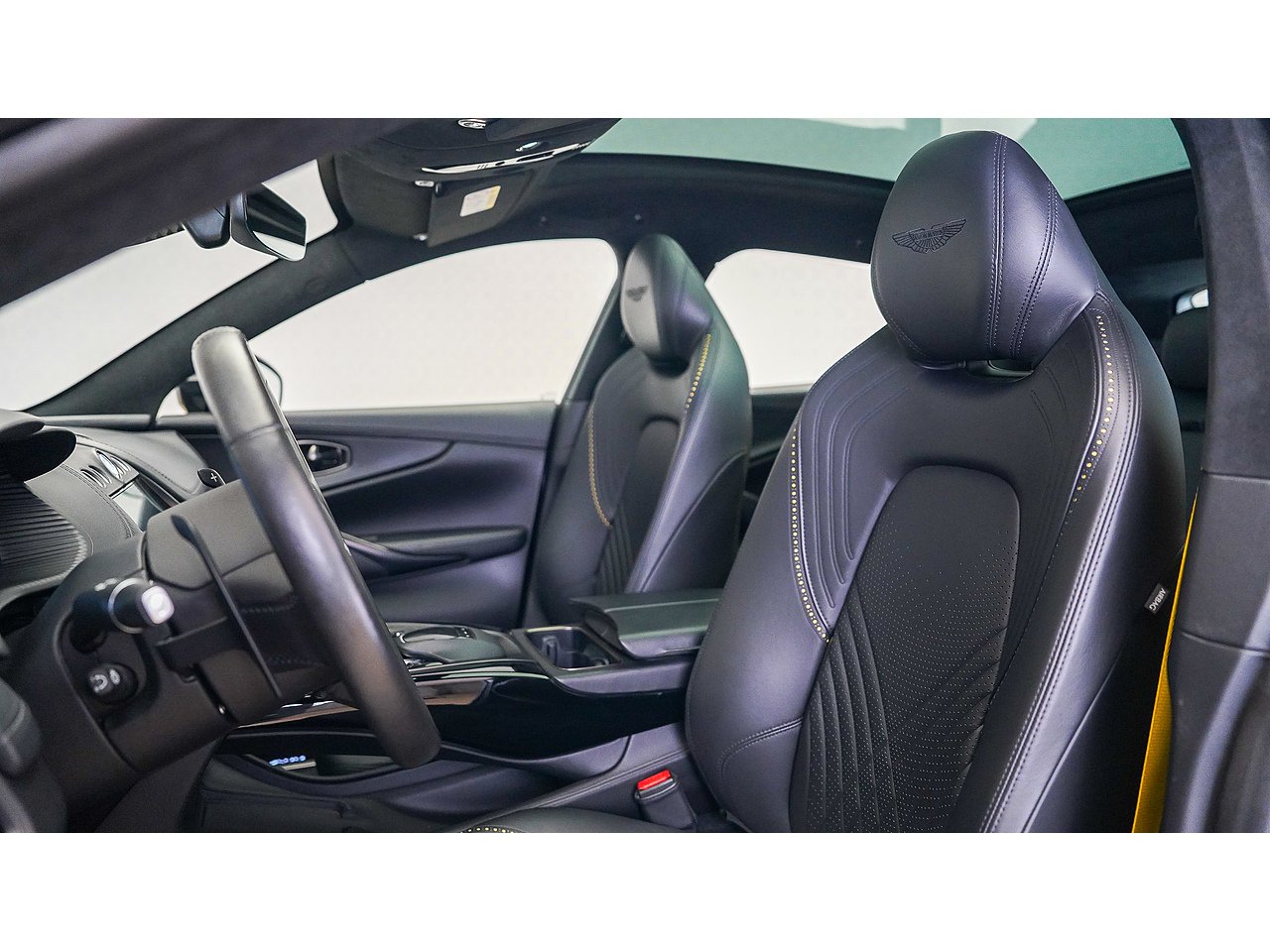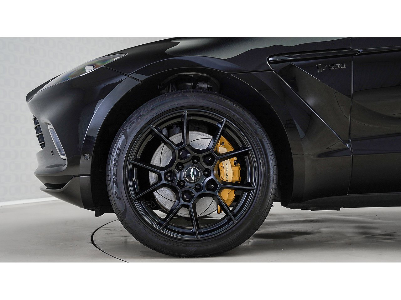 Yellow painted brake calipers with Aston Martin branding,