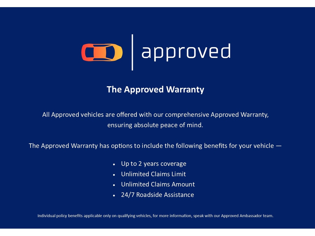 Warranty: 2 Years Approved Automotive Double Extended Warranty, including unlimited claim limit and 24/7 Roadside Assistance.