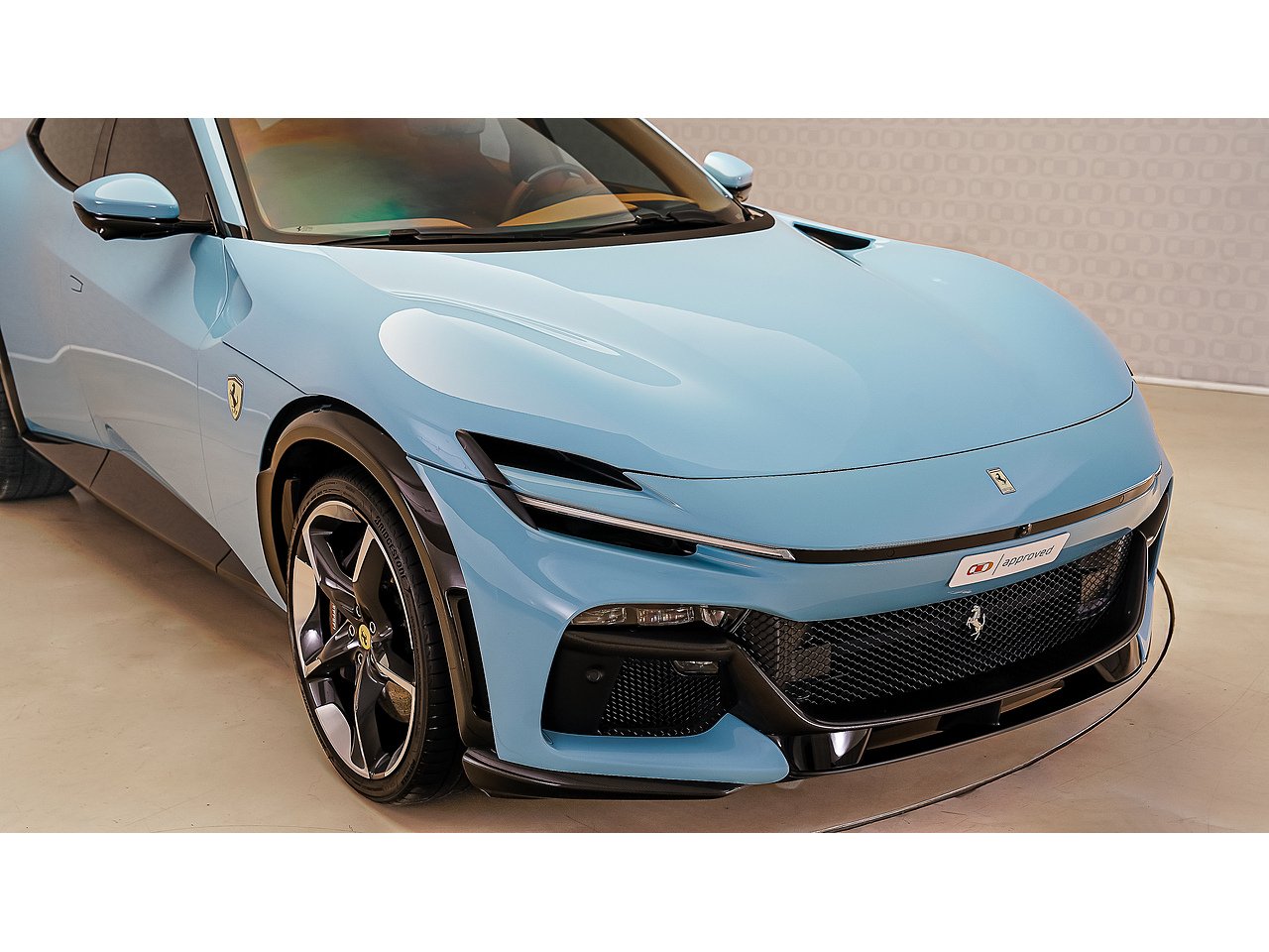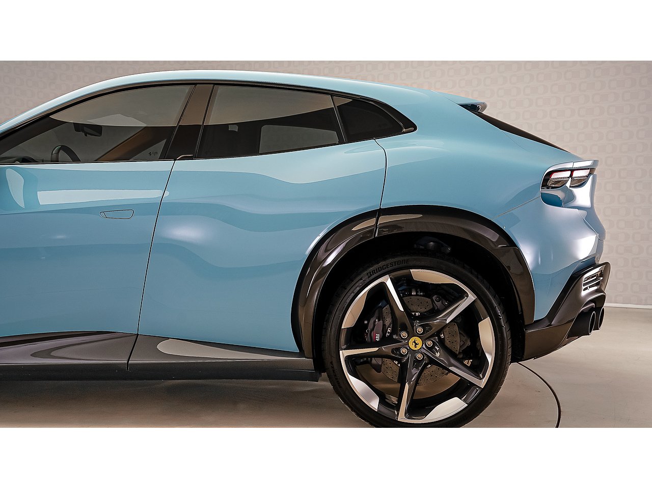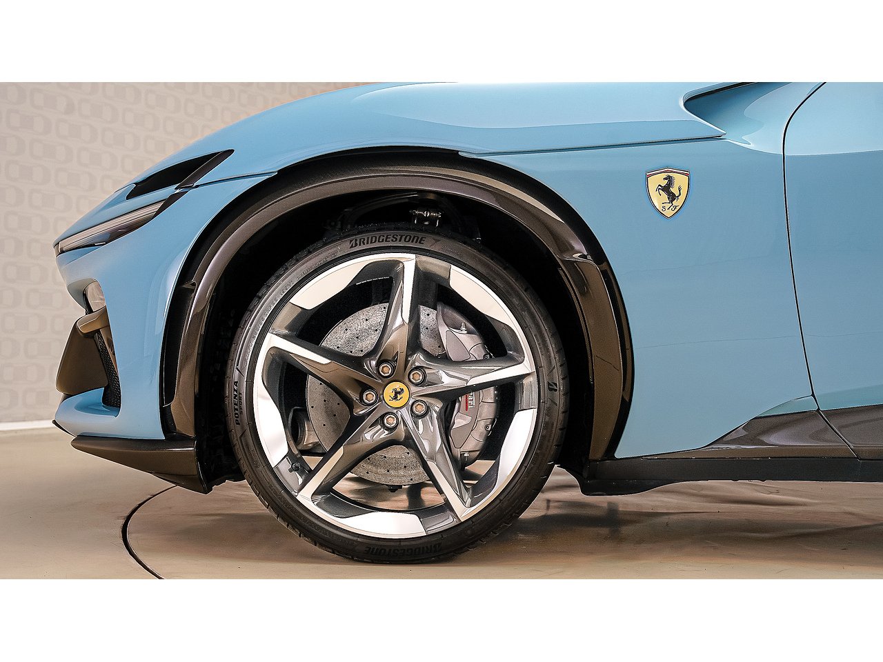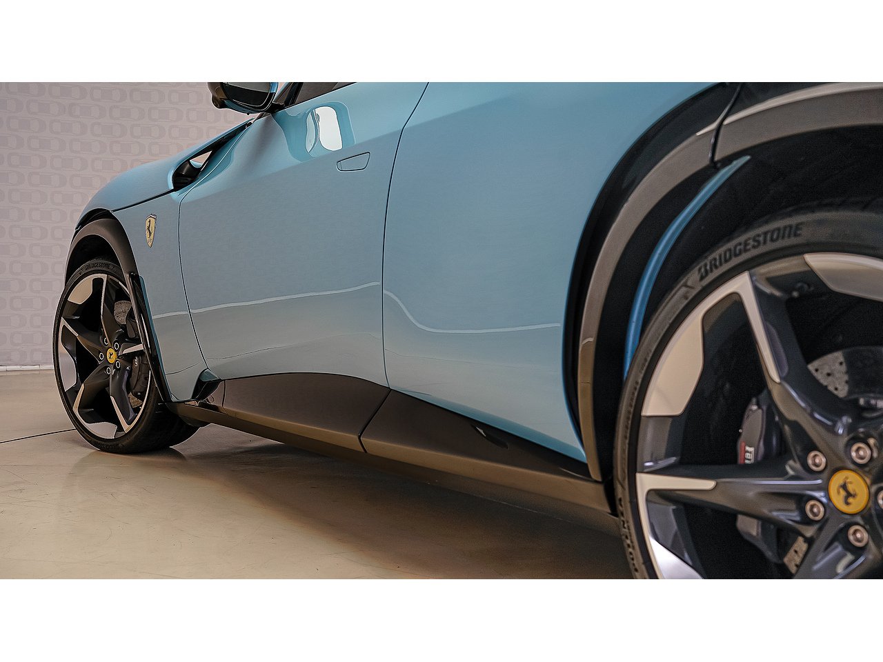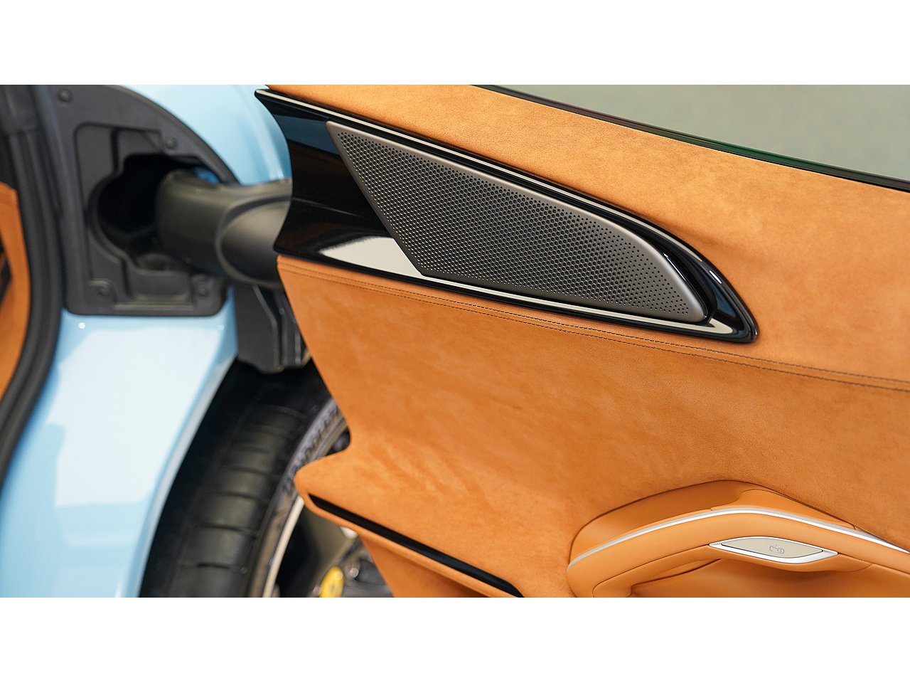 Finished in rare Azzurro La Plata with a Cuoio interior, this GCC-spec example features special two-layer paint, rear glossy forged diamond alloy wheels, carbon fibre wheelhouse flares, and Scuderia Ferrari shields. The cabin is equally special, highlighted by carbon fibre steering wheel with LEDs, panoramic roof and a passenger display.
