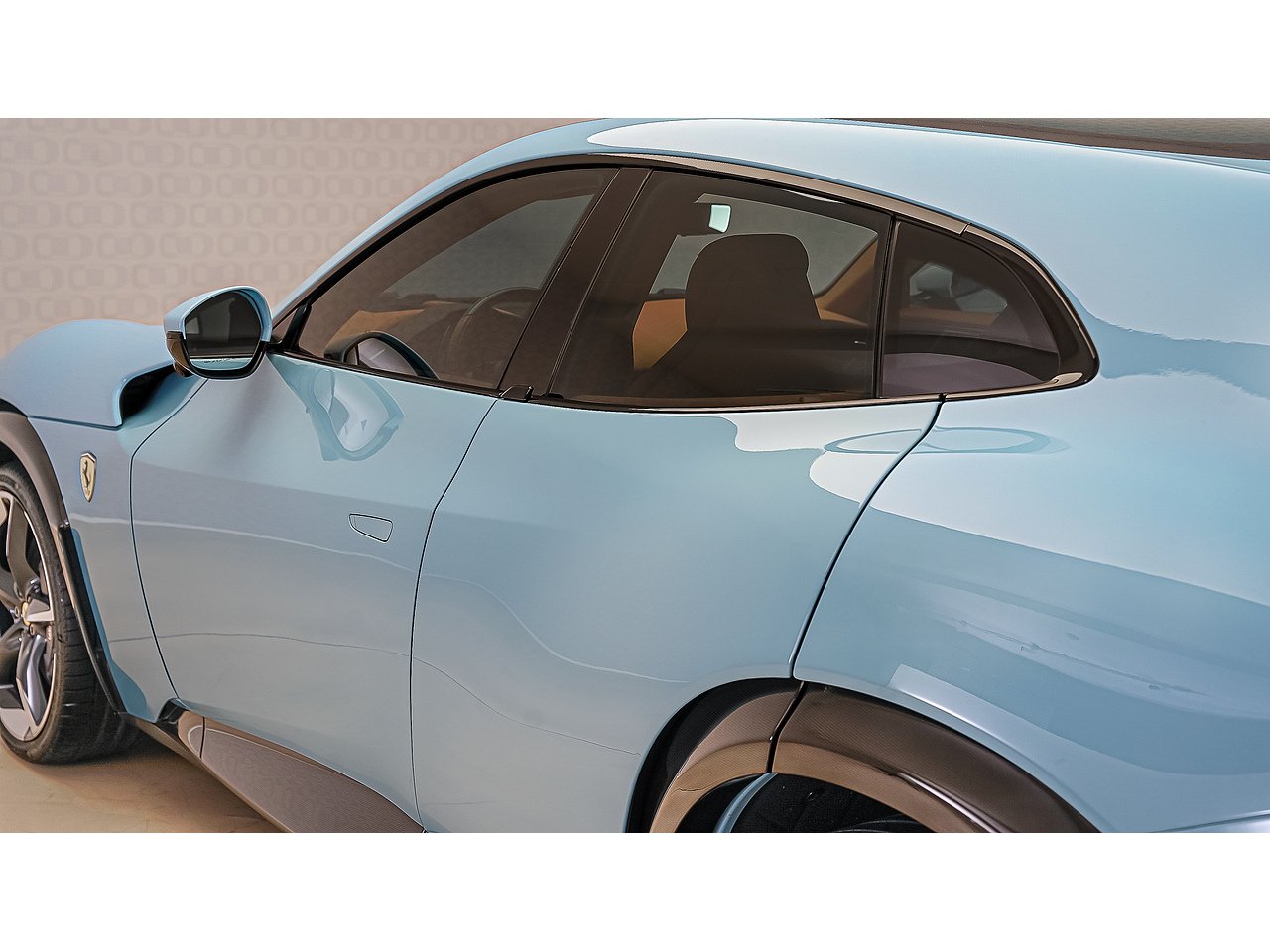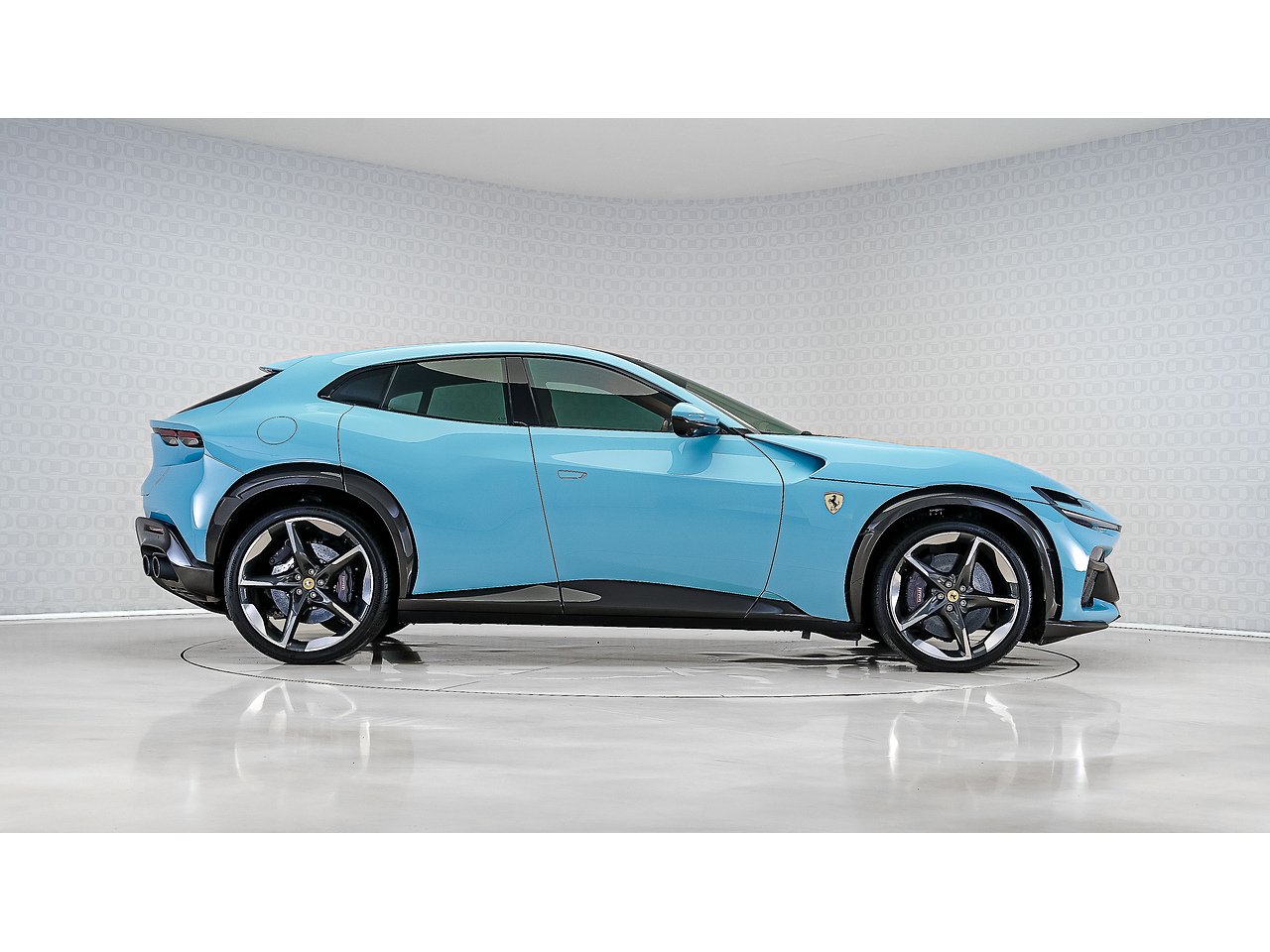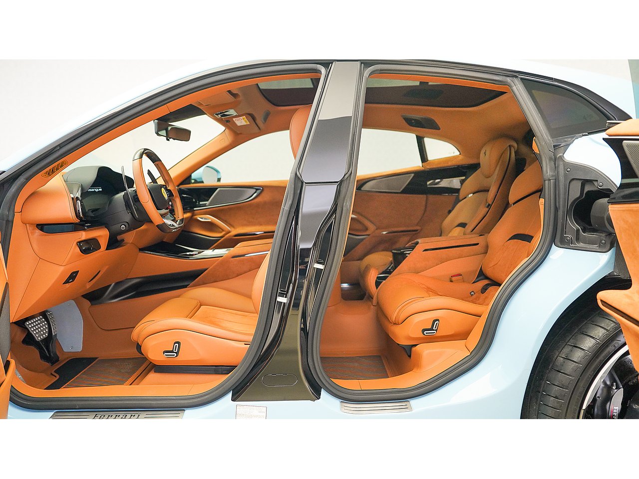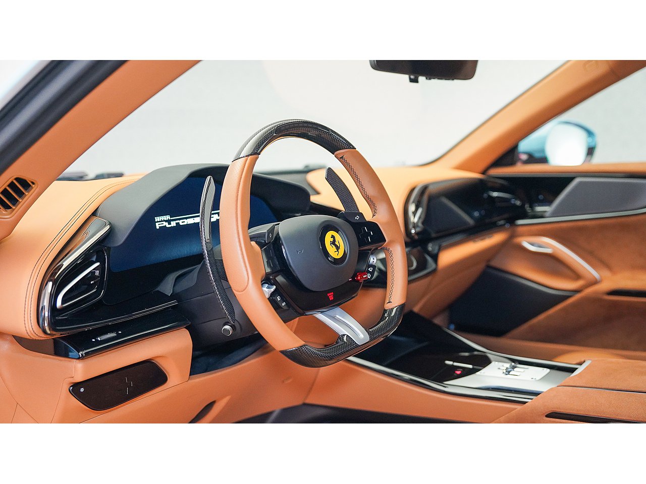 Finished in rare Azzurro La Plata with a Cuoio interior, this GCC-spec example features special two-layer paint, rear glossy forged diamond alloy wheels, carbon fibre wheelhouse flares, and Scuderia Ferrari shields. The cabin is equally special, highlighted by carbon fibre steering wheel with LEDs, panoramic roof and a passenger display.