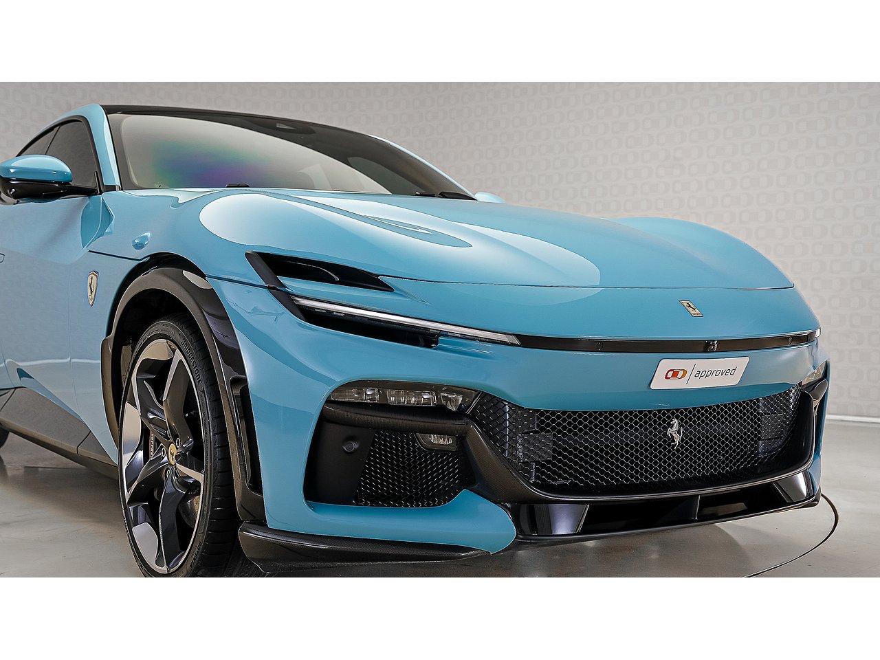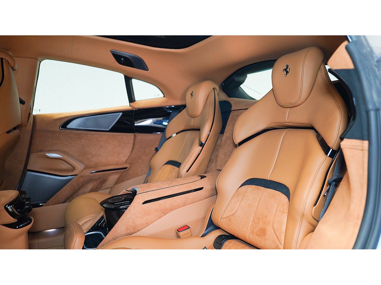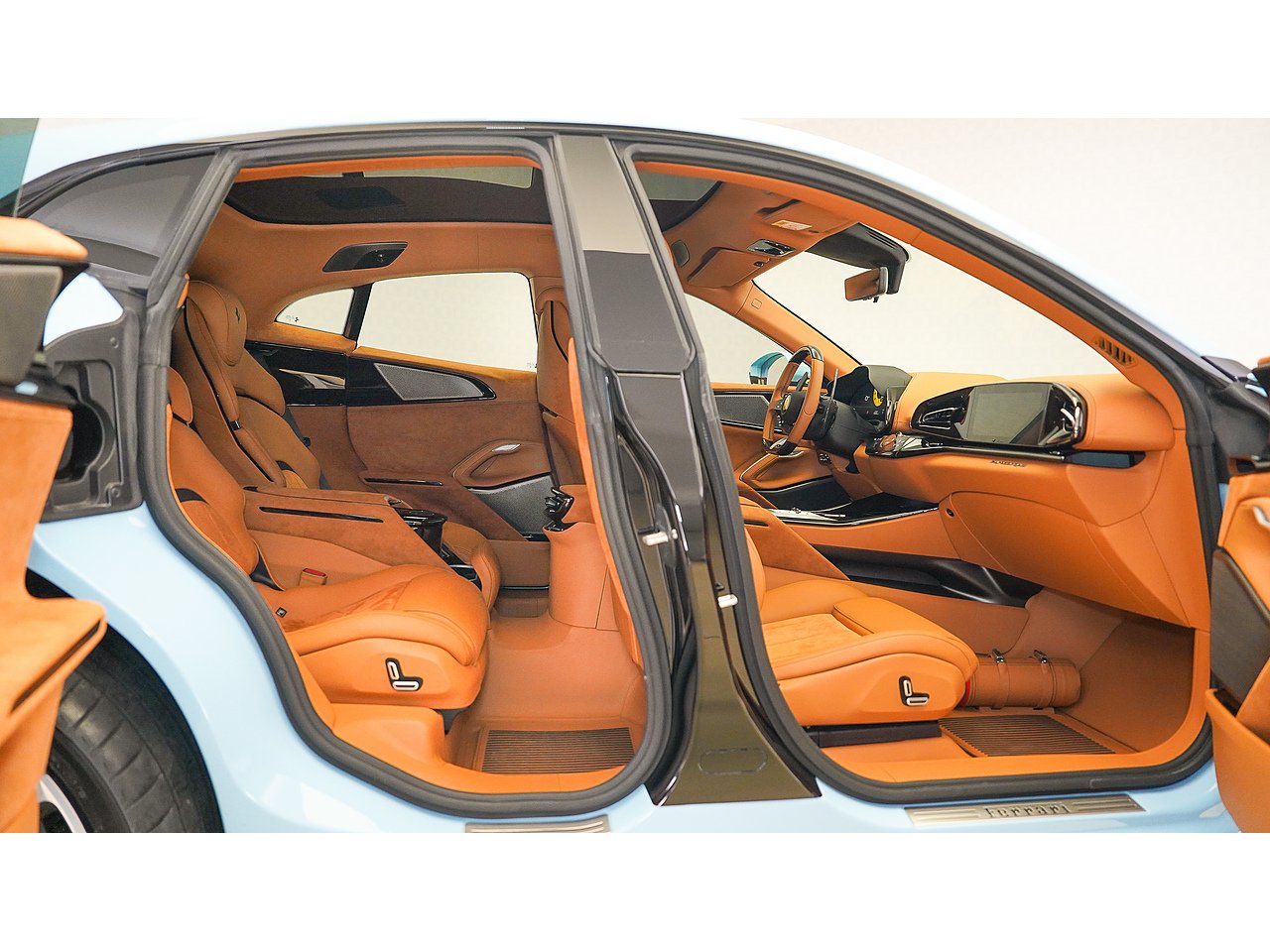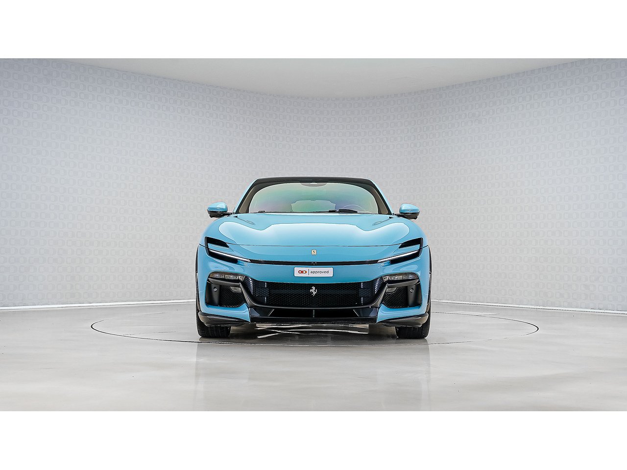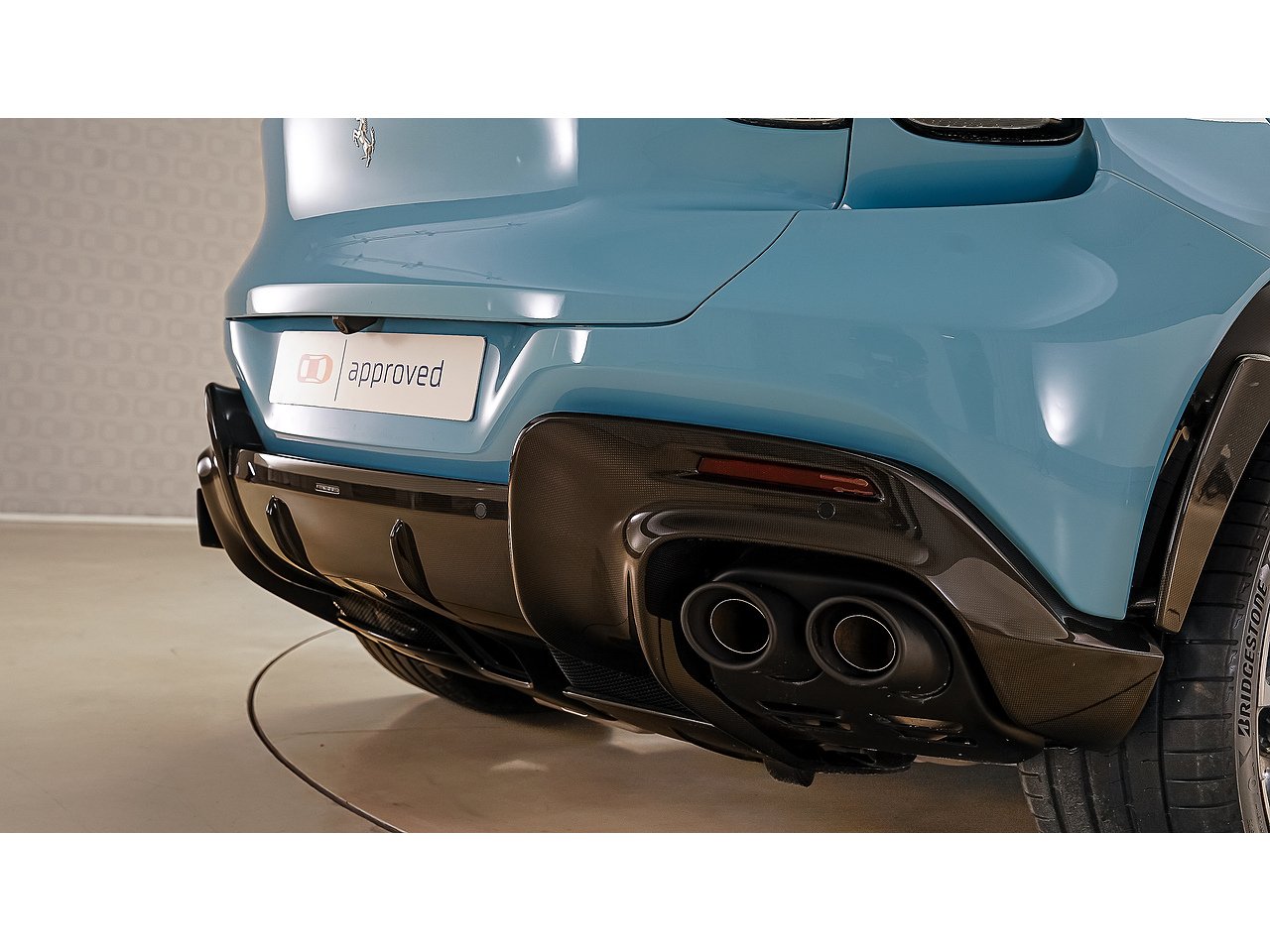 Finished in rare Azzurro La Plata with a Cuoio interior, this GCC-spec example features special two-layer paint, rear glossy forged diamond alloy wheels, carbon fibre wheelhouse flares, and Scuderia Ferrari shields. The cabin is equally special, highlighted by carbon fibre steering wheel with LEDs, panoramic roof and a passenger display.