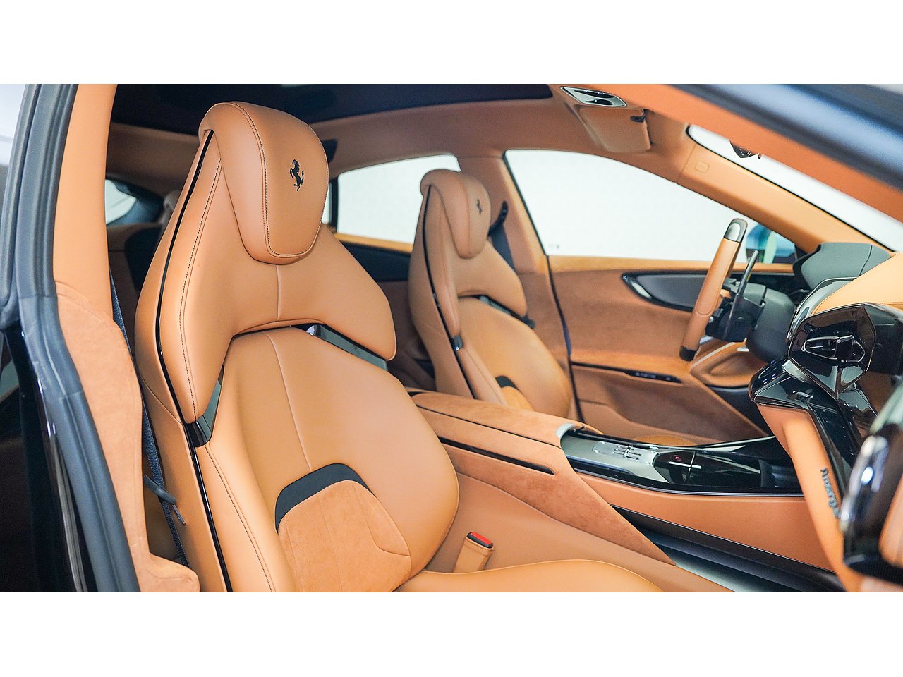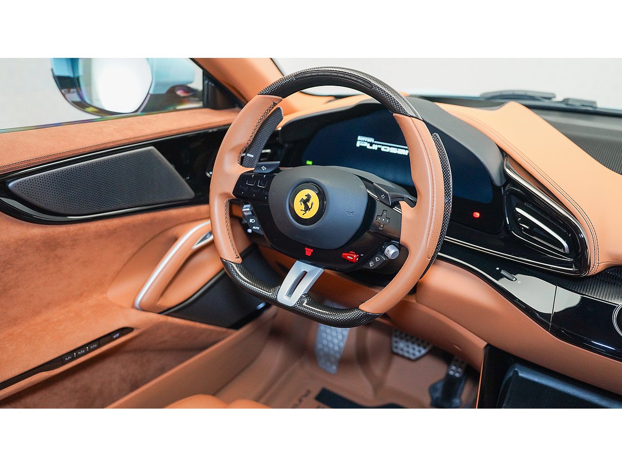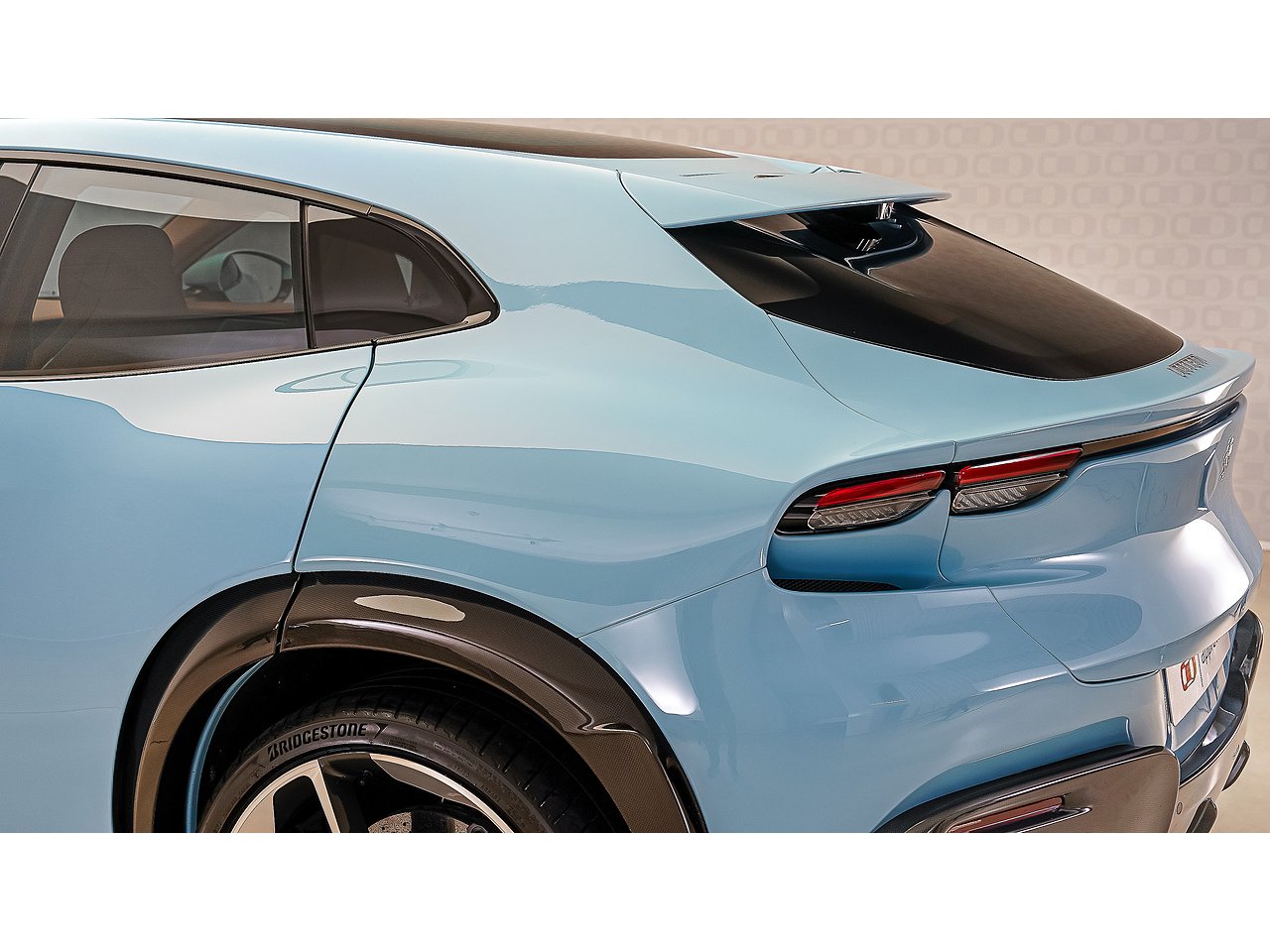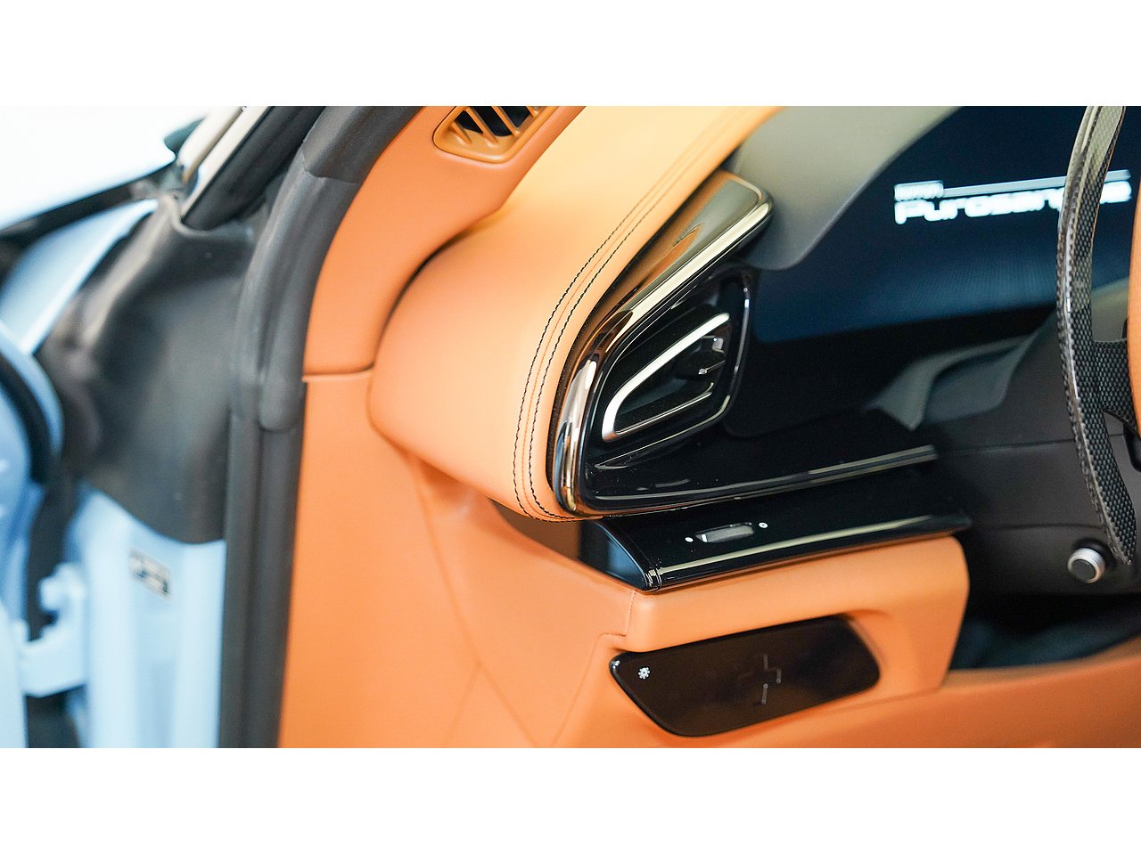 Finished in rare Azzurro La Plata with a Cuoio interior, this GCC-spec example features special two-layer paint, rear glossy forged diamond alloy wheels, carbon fibre wheelhouse flares, and Scuderia Ferrari shields. The cabin is equally special, highlighted by carbon fibre steering wheel with LEDs, panoramic roof and a passenger display.