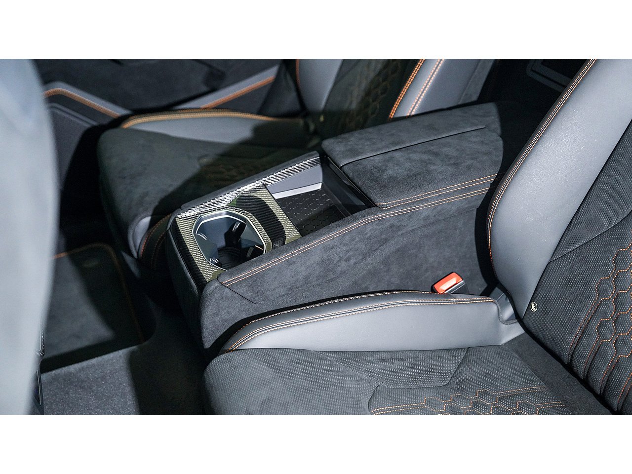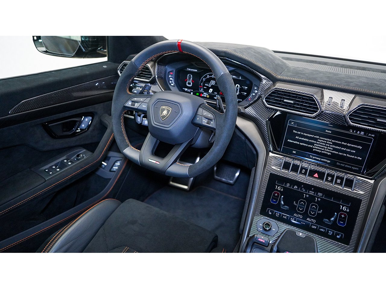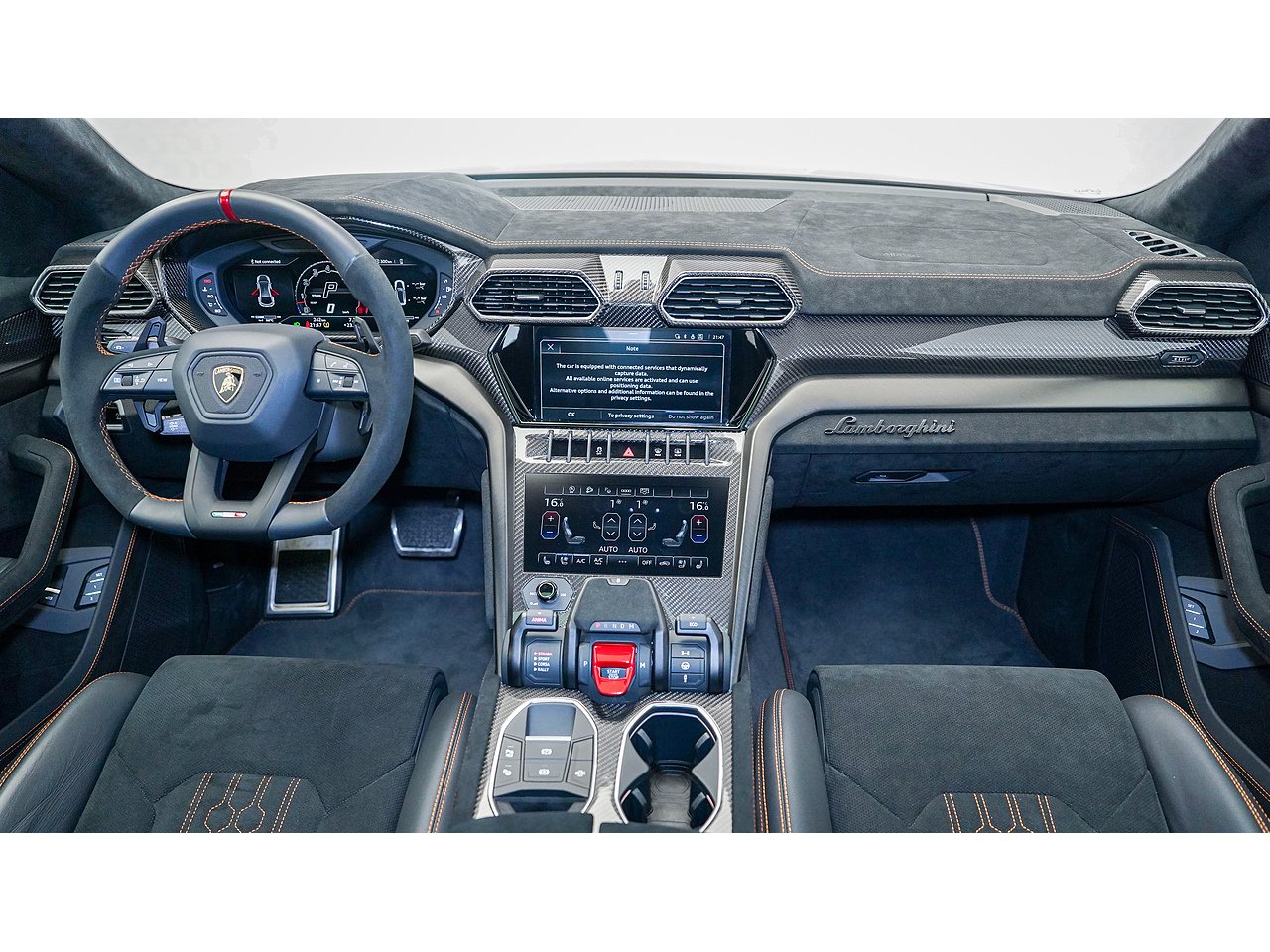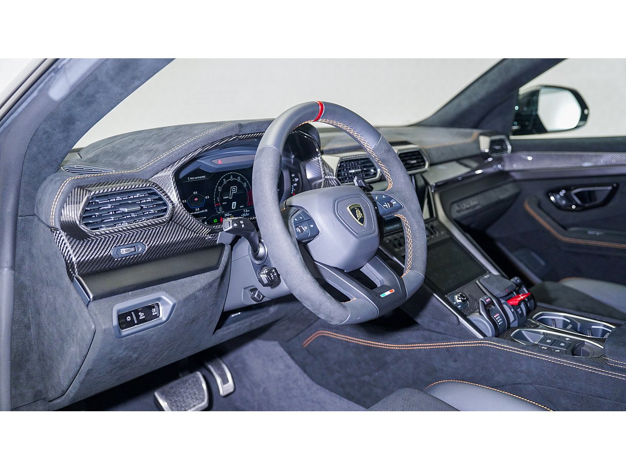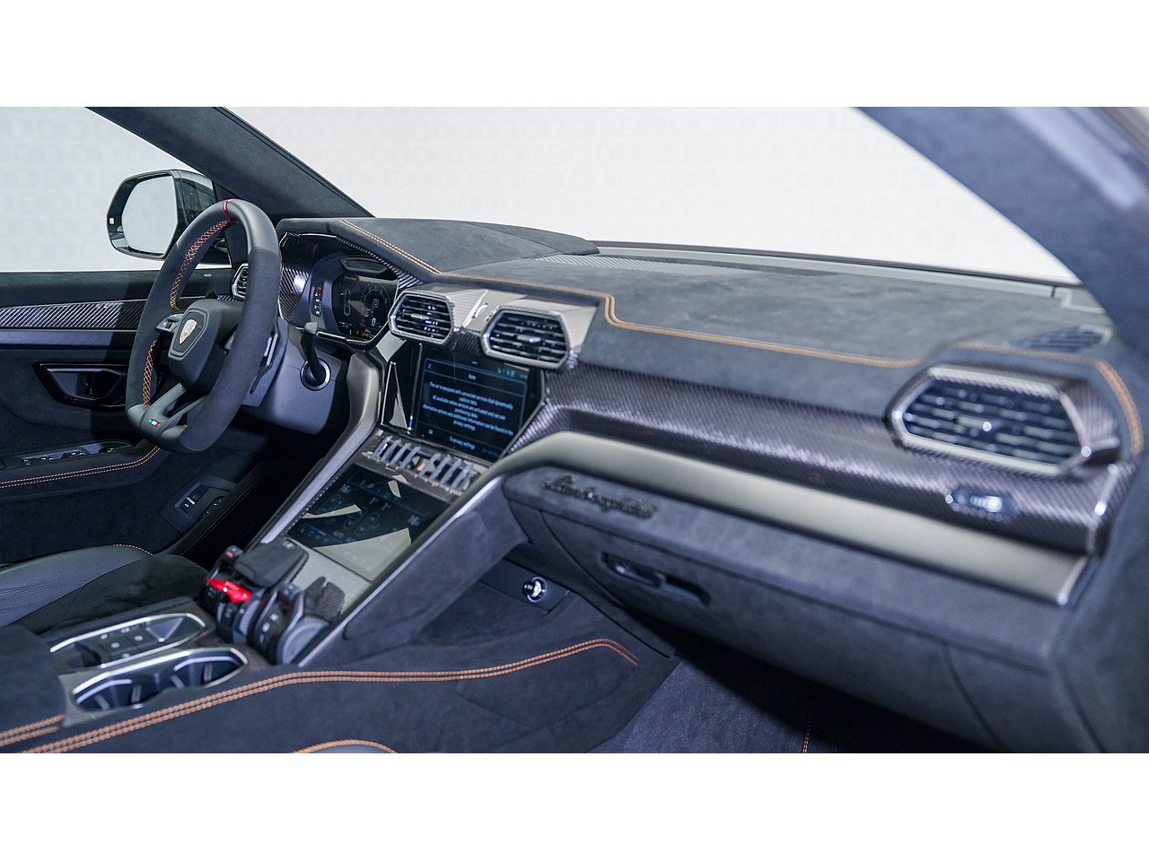Alcantara dashboard and steering wheel with orange stitching and red centre marker,