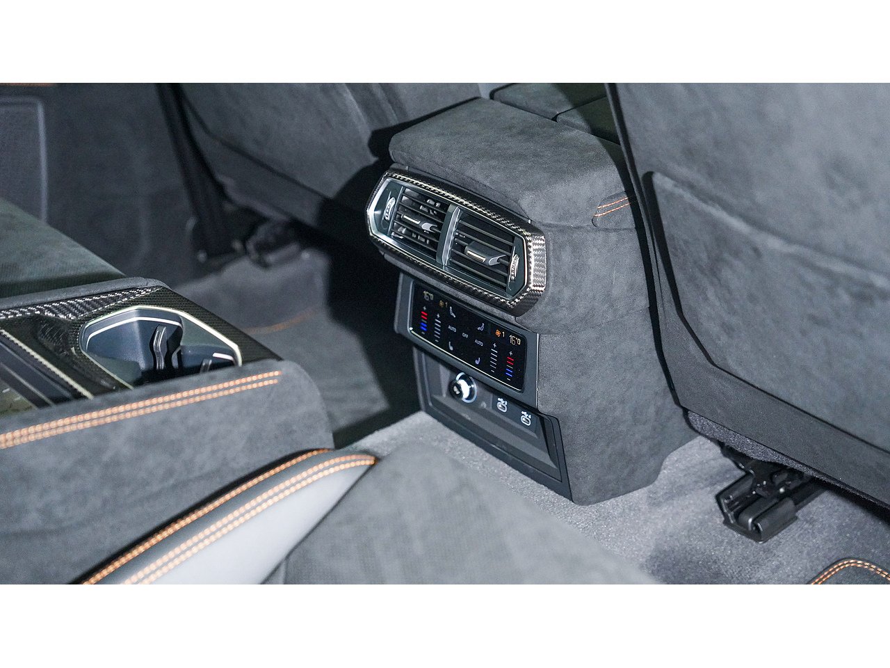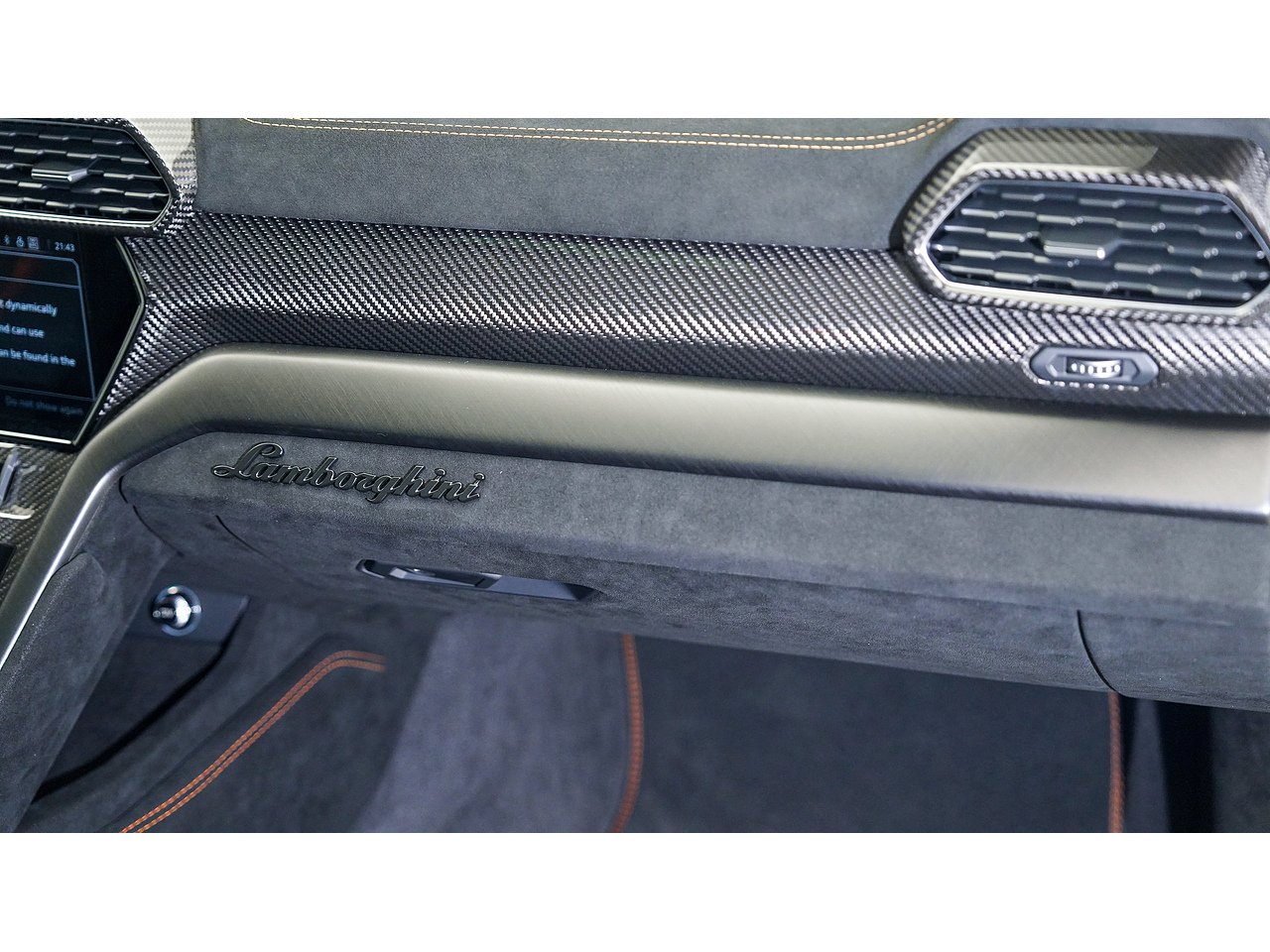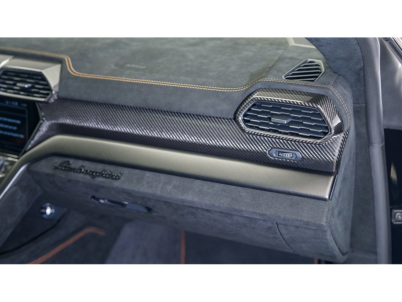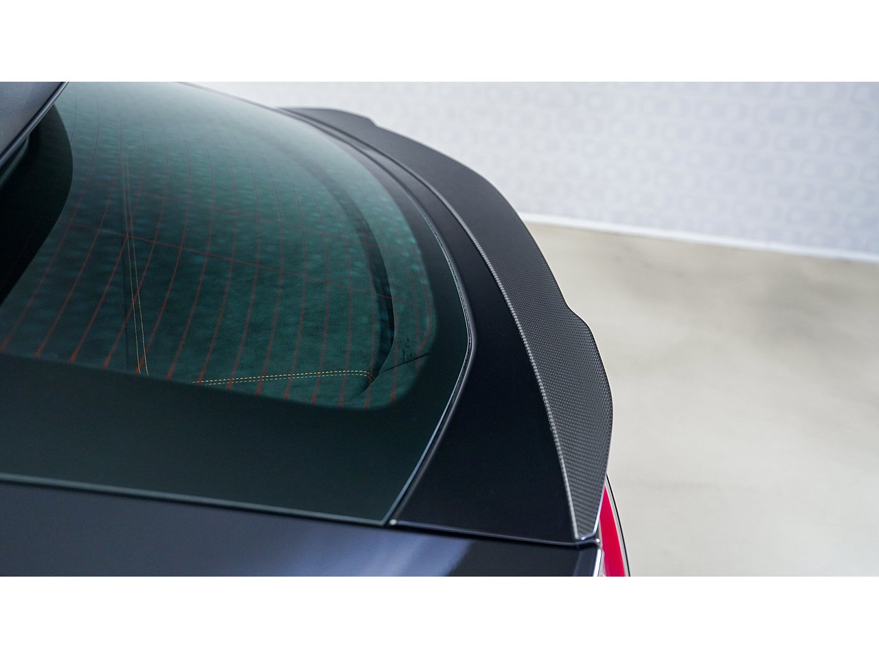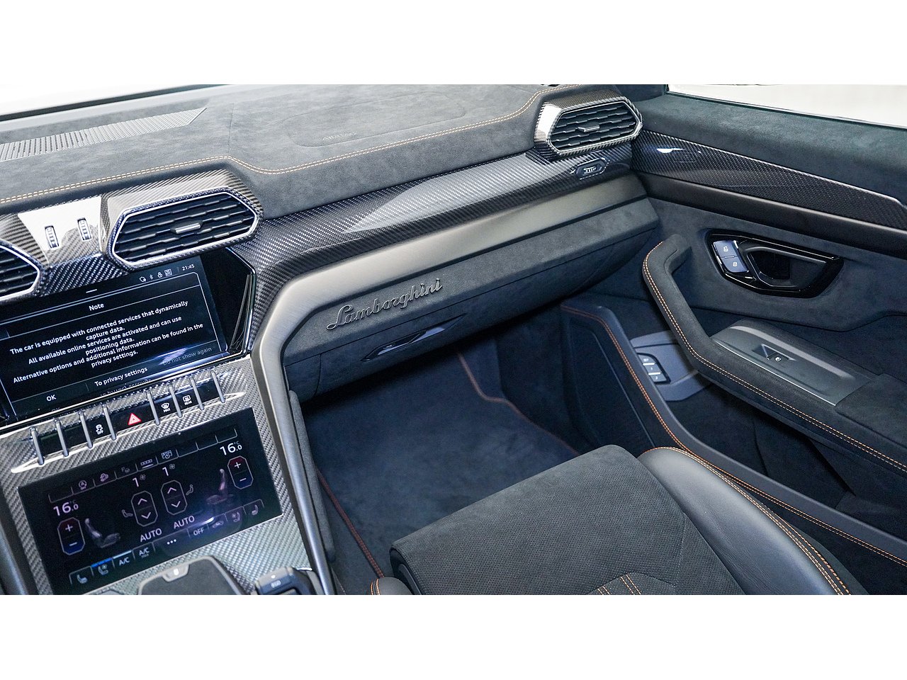Alcantara dashboard and steering wheel with orange stitching and red centre marker,