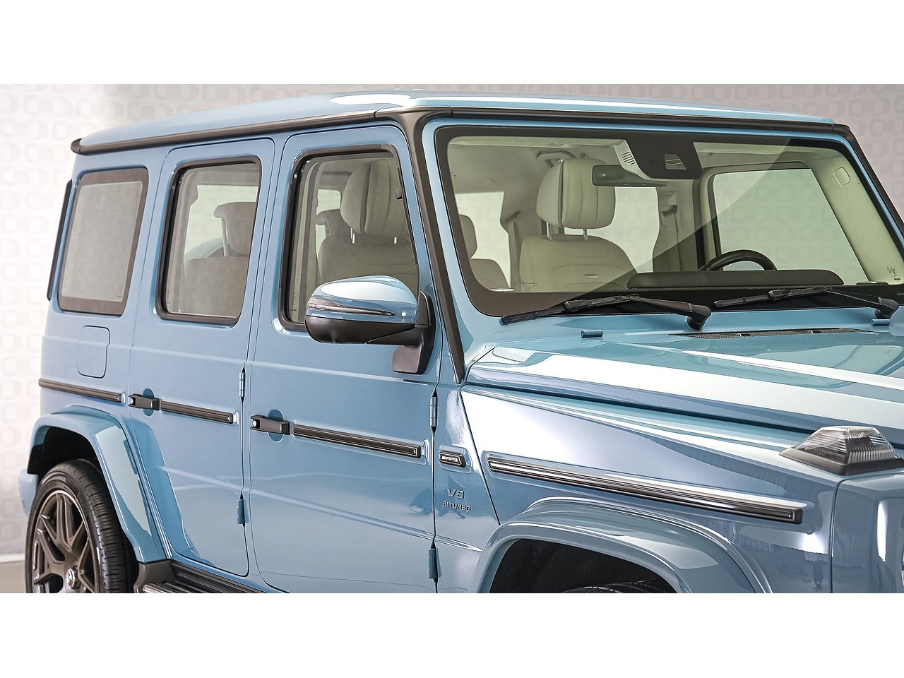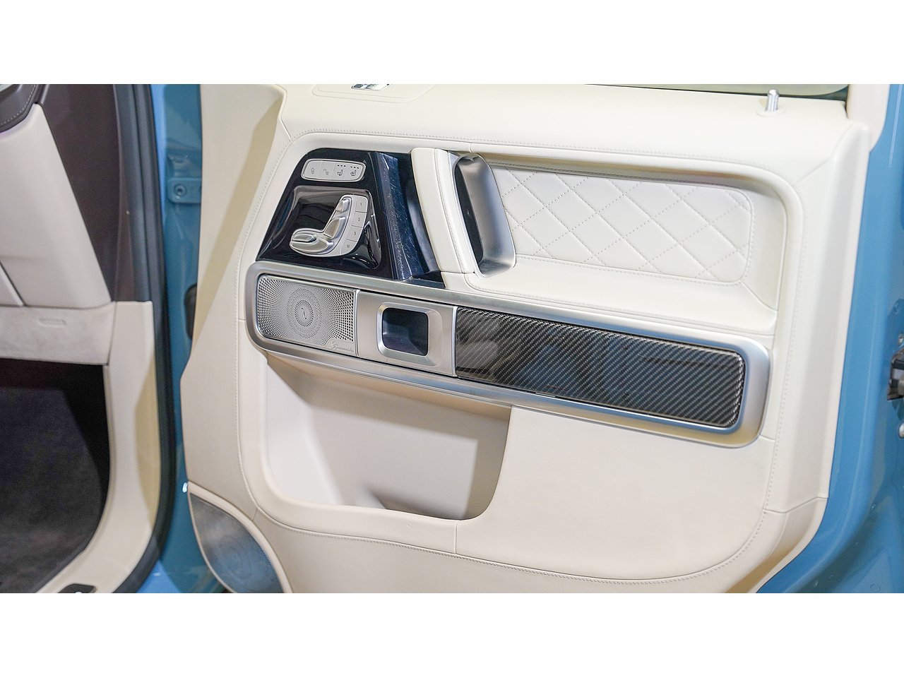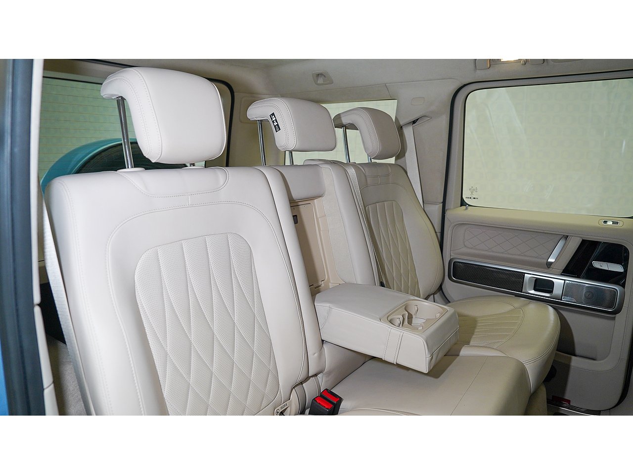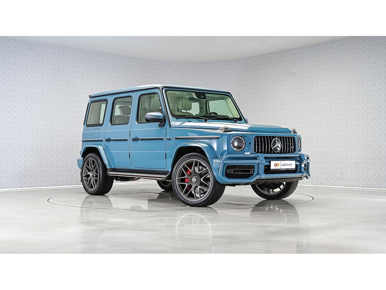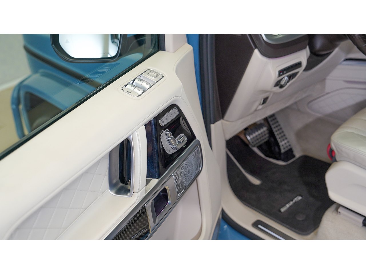 2021 Mercedes-Benz G 63 AMG MANUFAKTUR finished in rare Vintage Blue over Macchiato Beige, GCC specification. Equipped with AMG Night Package and AMG Carbon Fibre interior trim, this example blends commanding V8 performance with a highly distinctive and elegant specification. A standout colour combination seldom seen on the market, offering individuality without compromising presence.