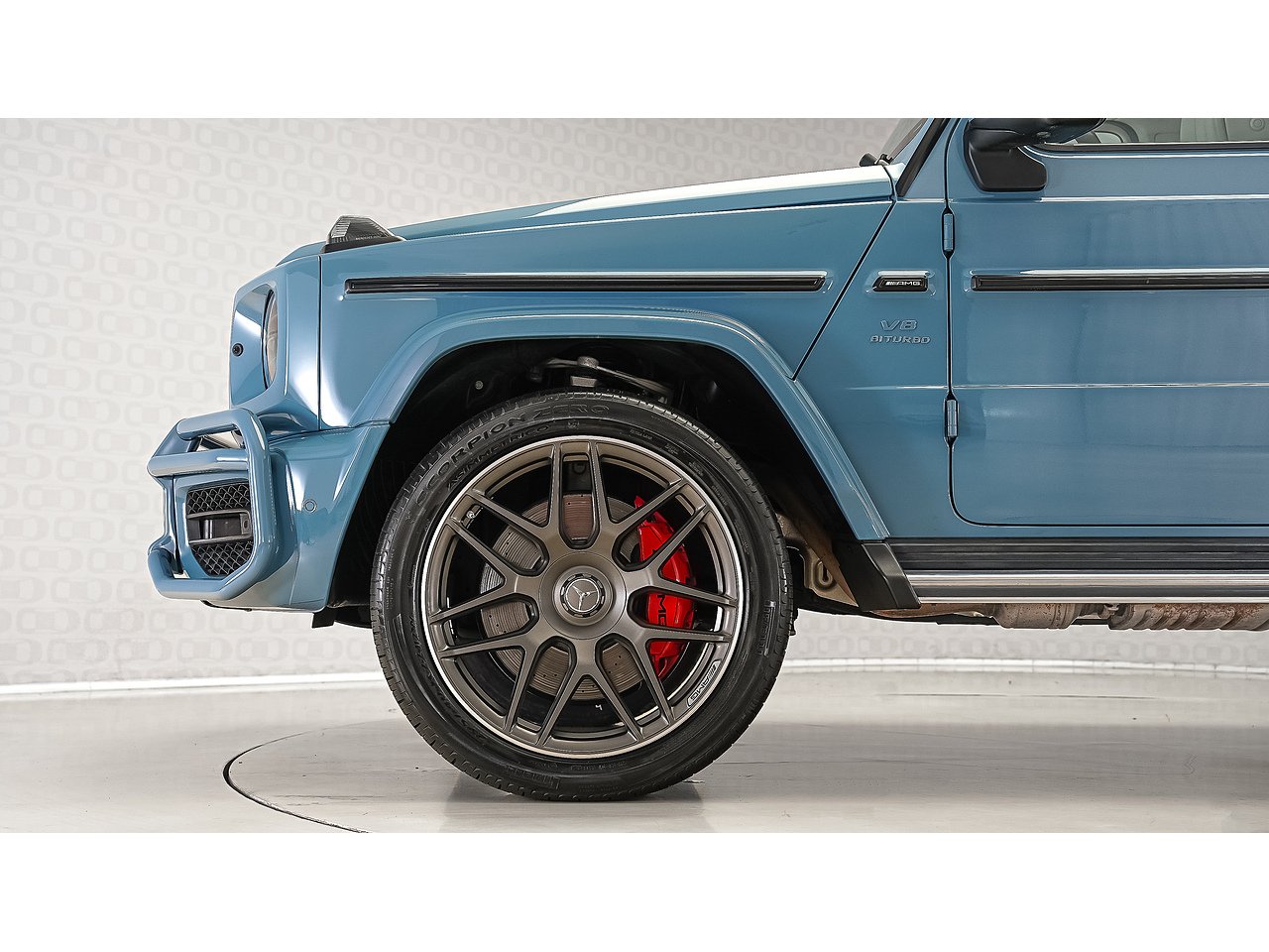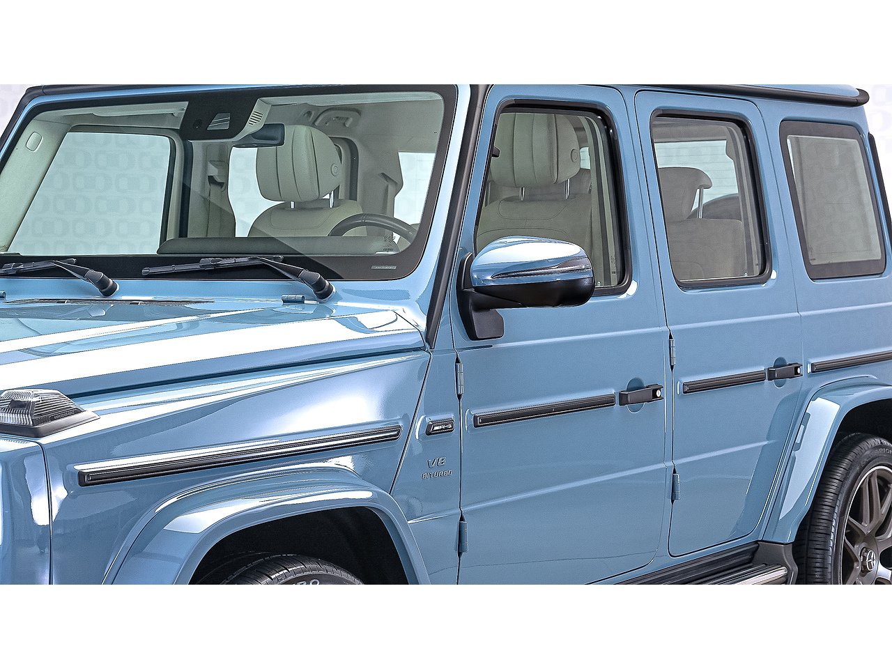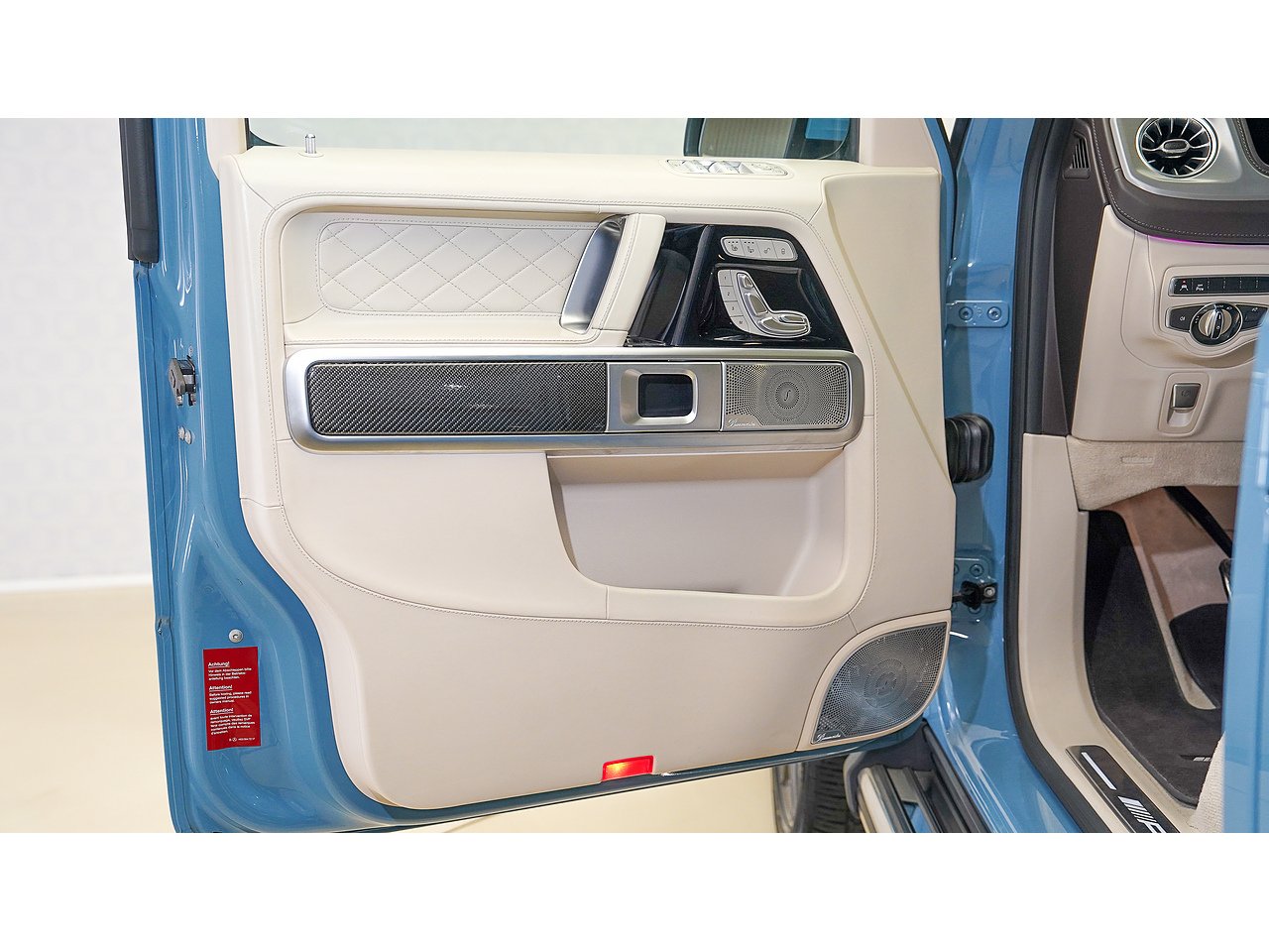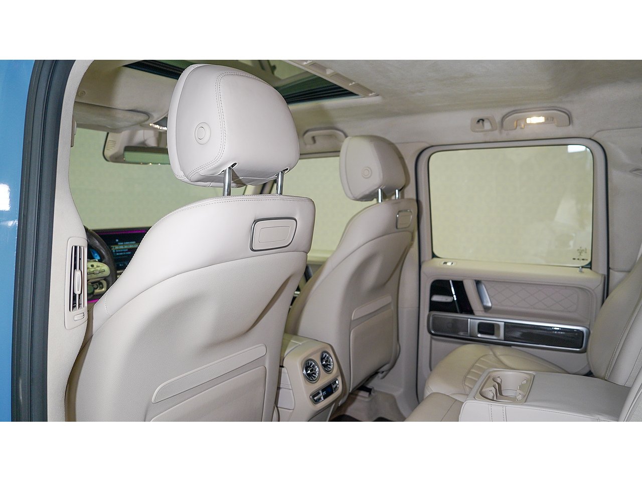 2021 Mercedes-Benz G 63 AMG MANUFAKTUR finished in rare Vintage Blue over Macchiato Beige, GCC specification. Equipped with AMG Night Package and AMG Carbon Fibre interior trim, this example blends commanding V8 performance with a highly distinctive and elegant specification. A standout colour combination seldom seen on the market, offering individuality without compromising presence.