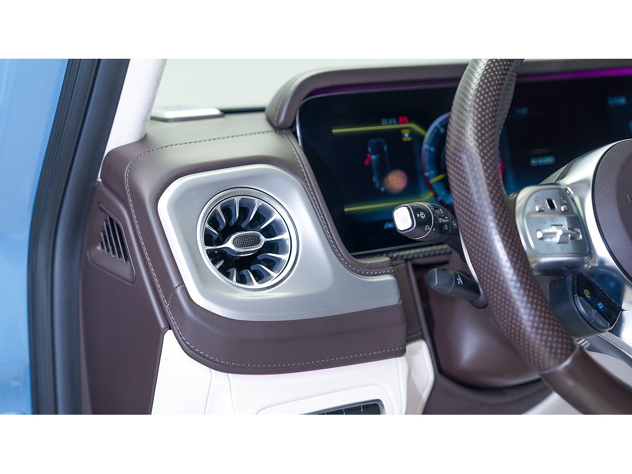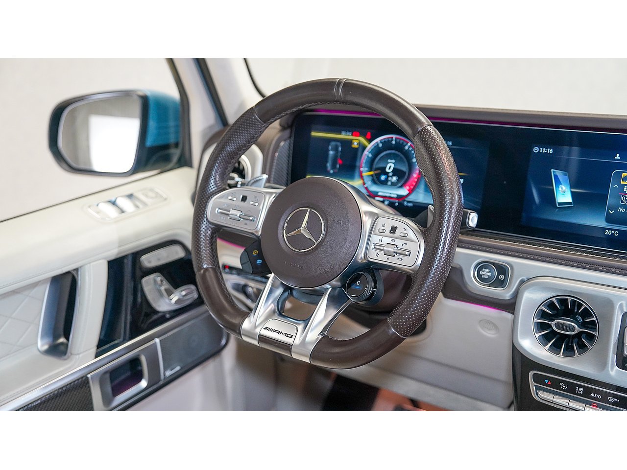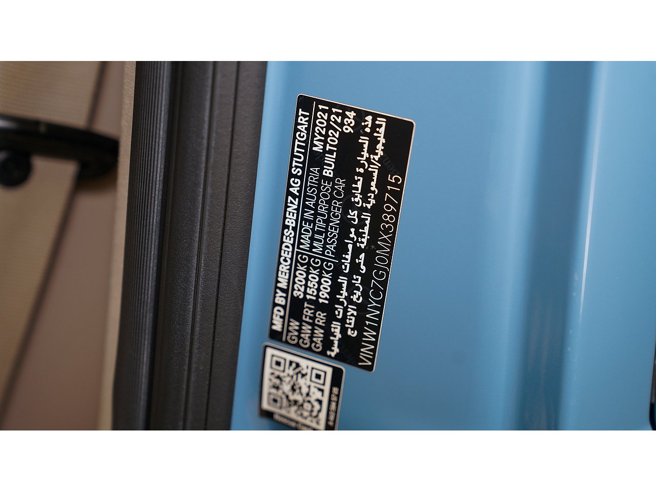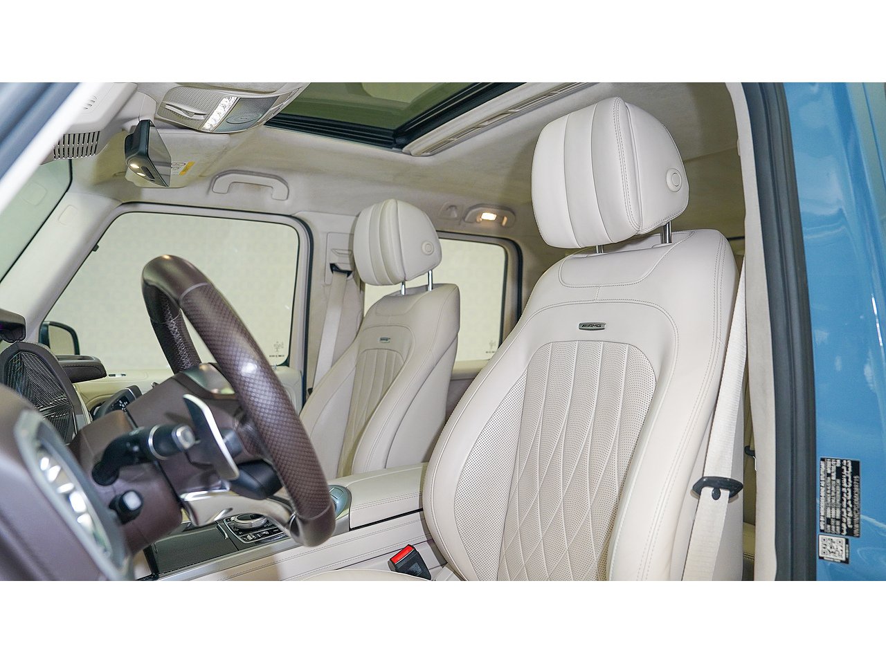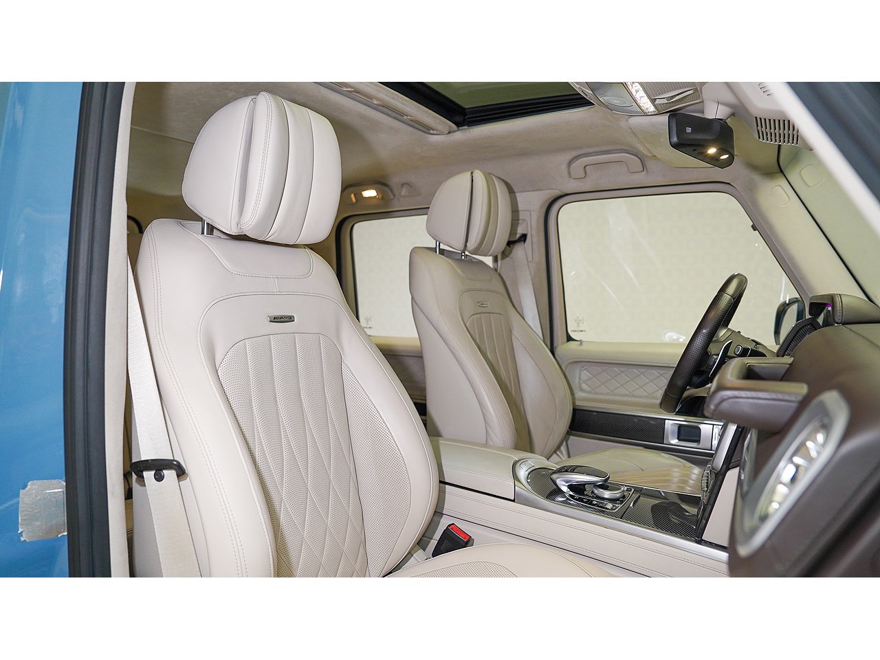 2021 Mercedes-Benz G 63 AMG MANUFAKTUR finished in rare Vintage Blue over Macchiato Beige, GCC specification. Equipped with AMG Night Package and AMG Carbon Fibre interior trim, this example blends commanding V8 performance with a highly distinctive and elegant specification. A standout colour combination seldom seen on the market, offering individuality without compromising presence.