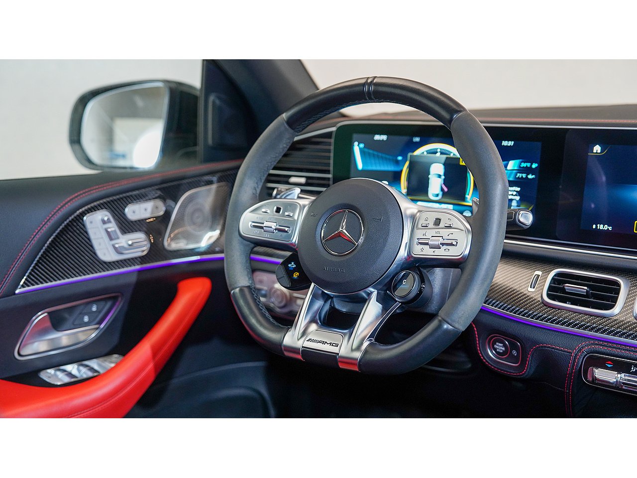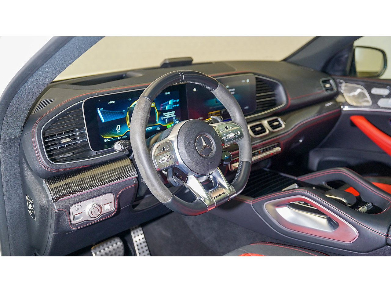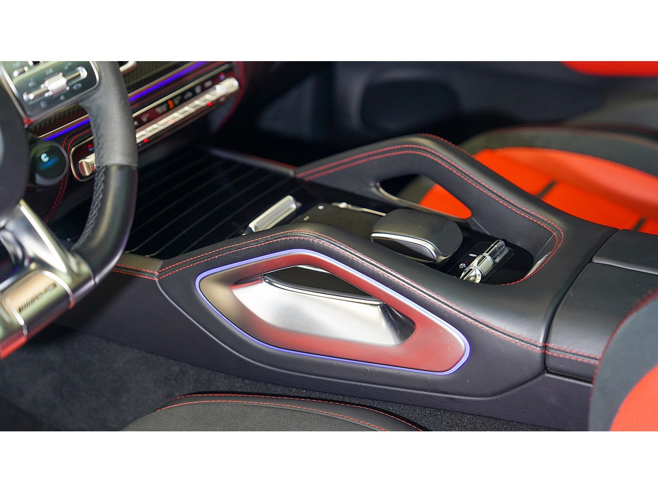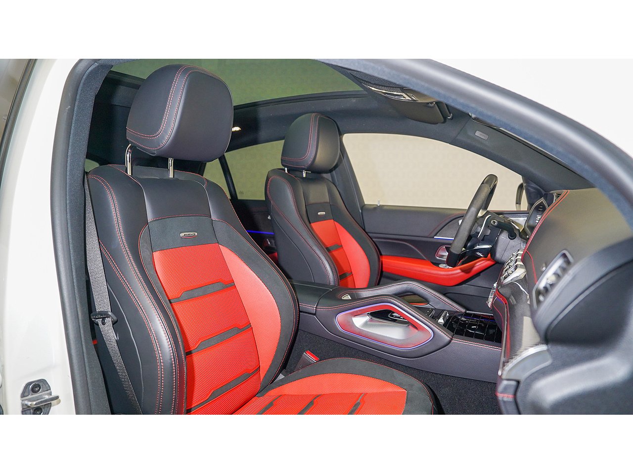 The cabin offers a driver-focused experience with features such as the widescreen MBUX infotainment system, Burmester surround sound, panoramic sliding sunroof, ventilated sport seats, ambient lighting, and AMG steering wheel in Nappa leather. Safety and convenience are enhanced with adaptive cruise control, parking assist, and 360-degree camera.