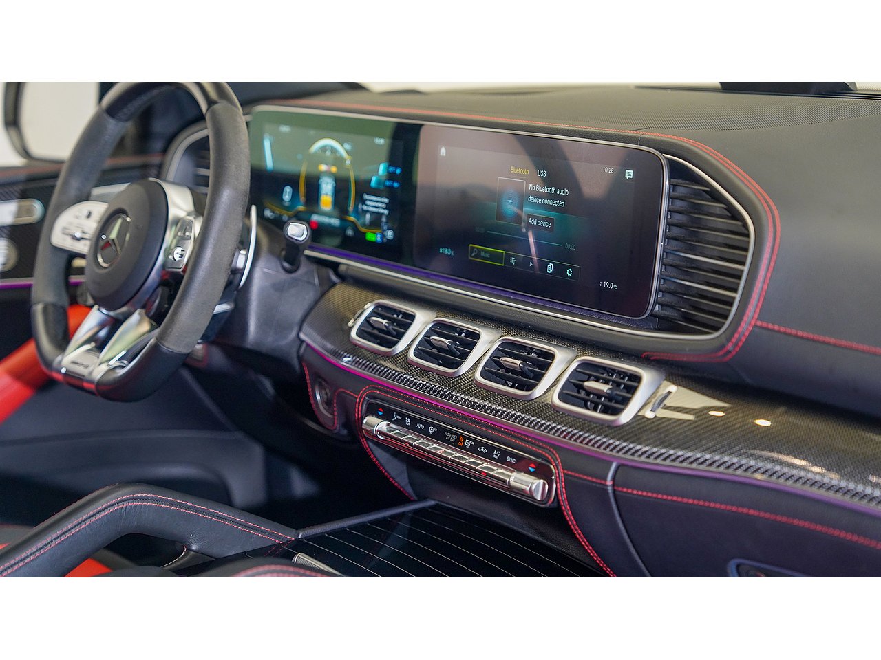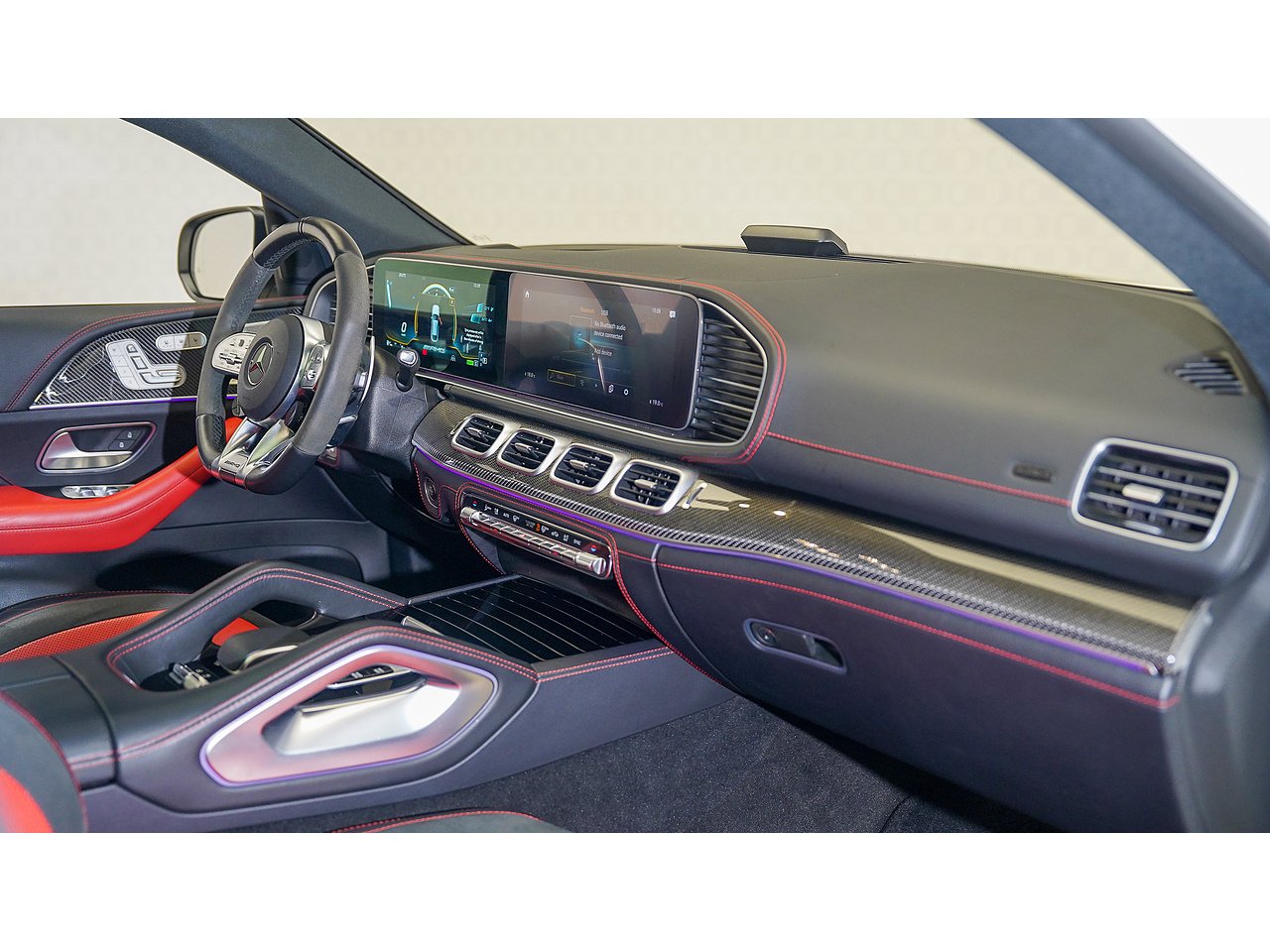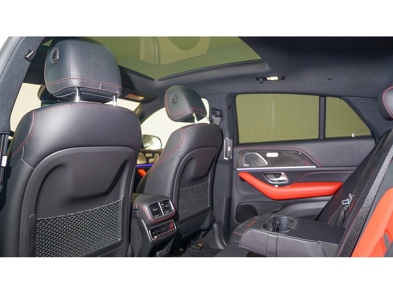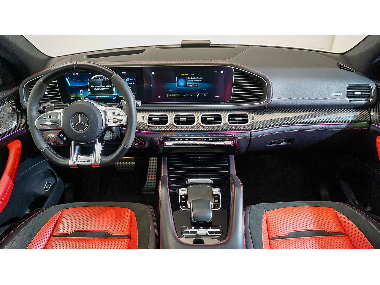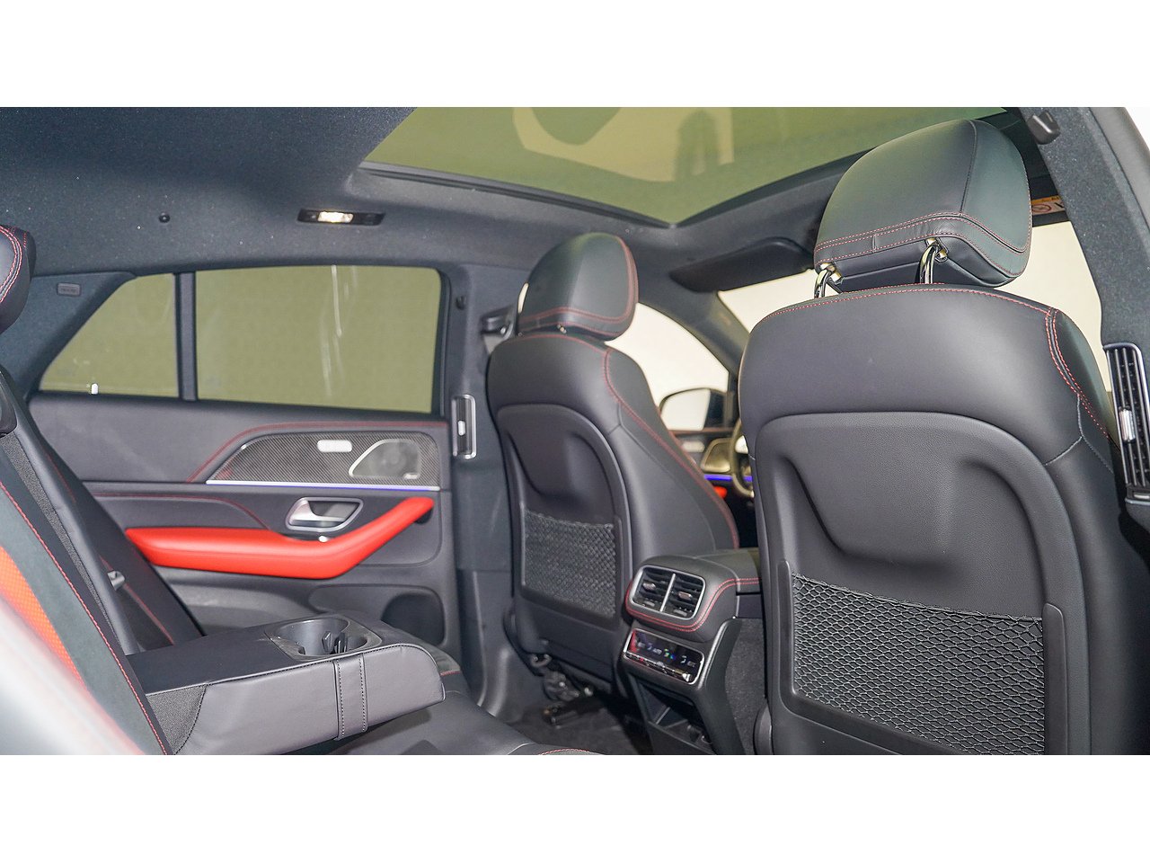 The cabin offers a driver-focused experience with features such as the widescreen MBUX infotainment system, Burmester surround sound, panoramic sliding sunroof, ventilated sport seats, ambient lighting, and AMG steering wheel in Nappa leather. Safety and convenience are enhanced with adaptive cruise control, parking assist, and 360-degree camera.