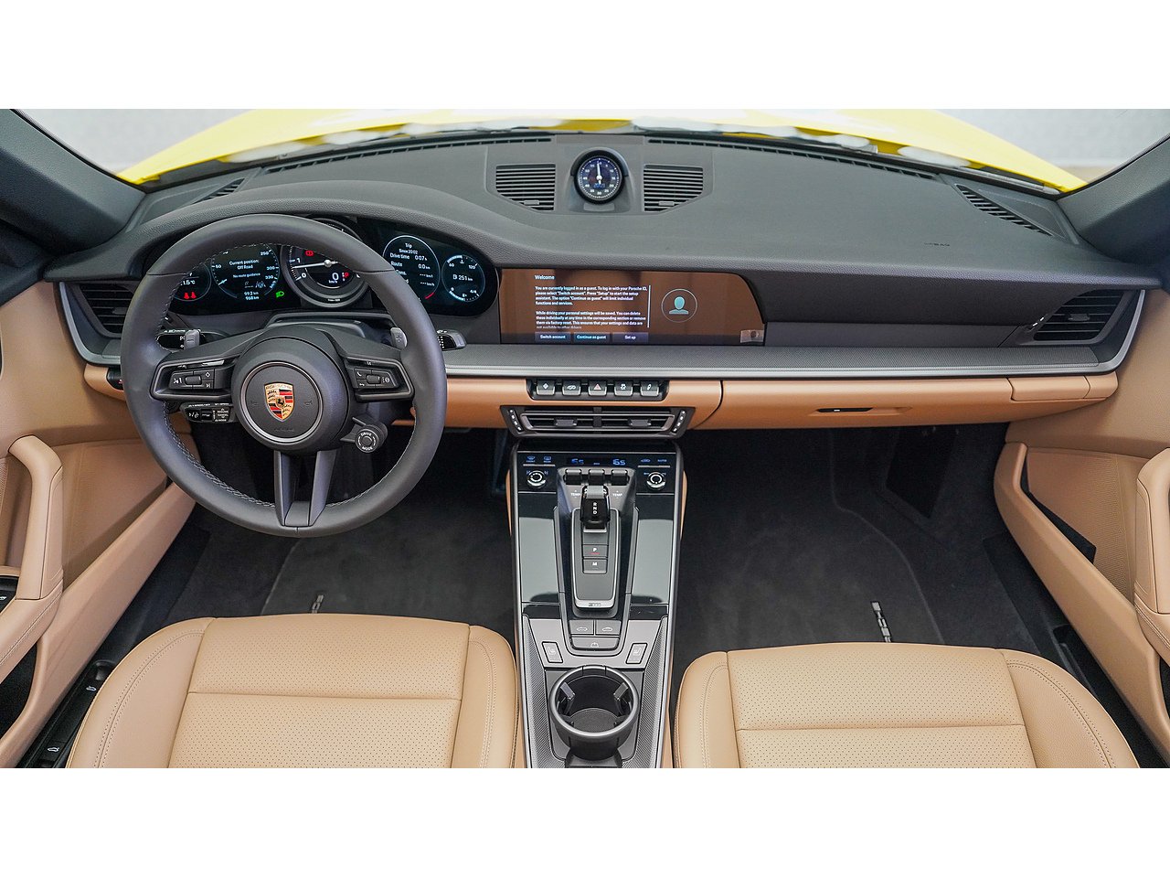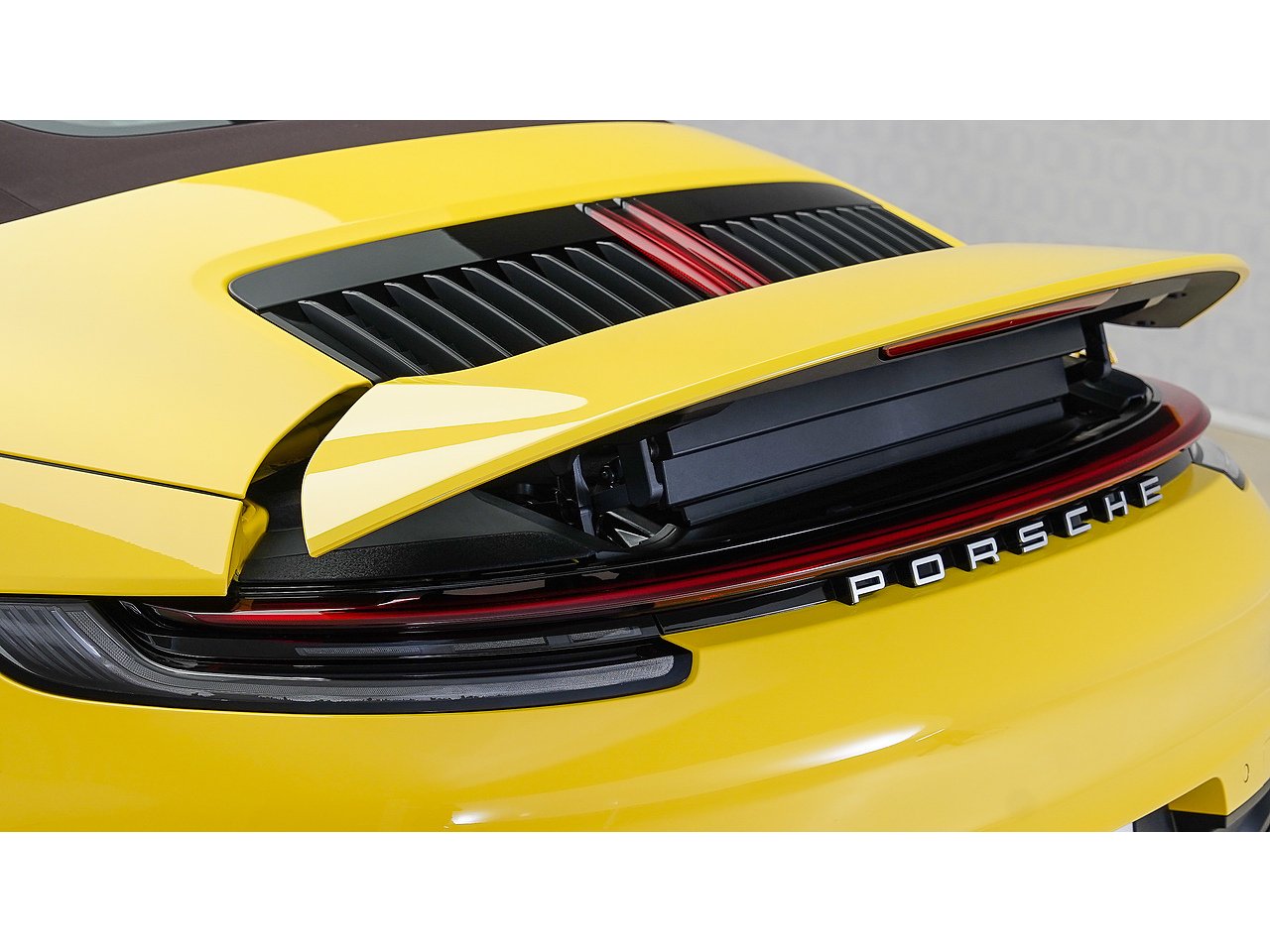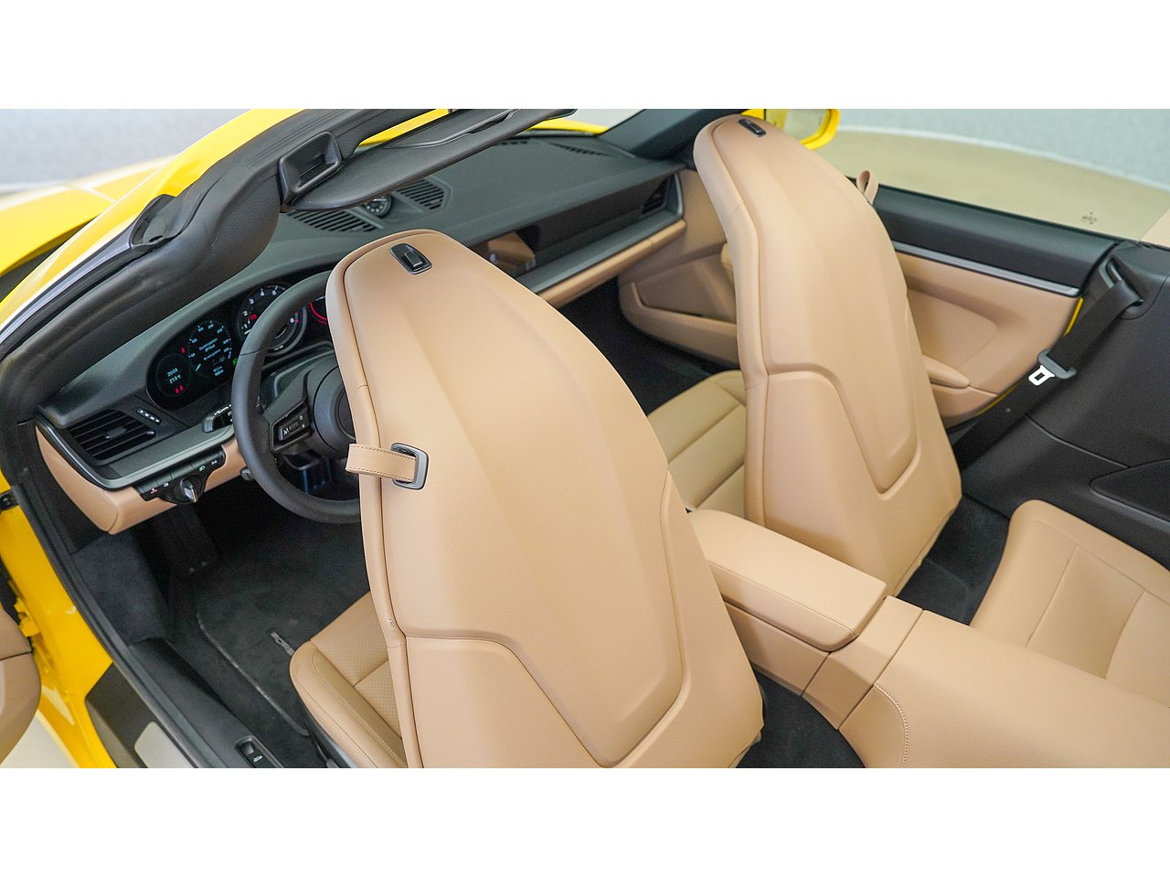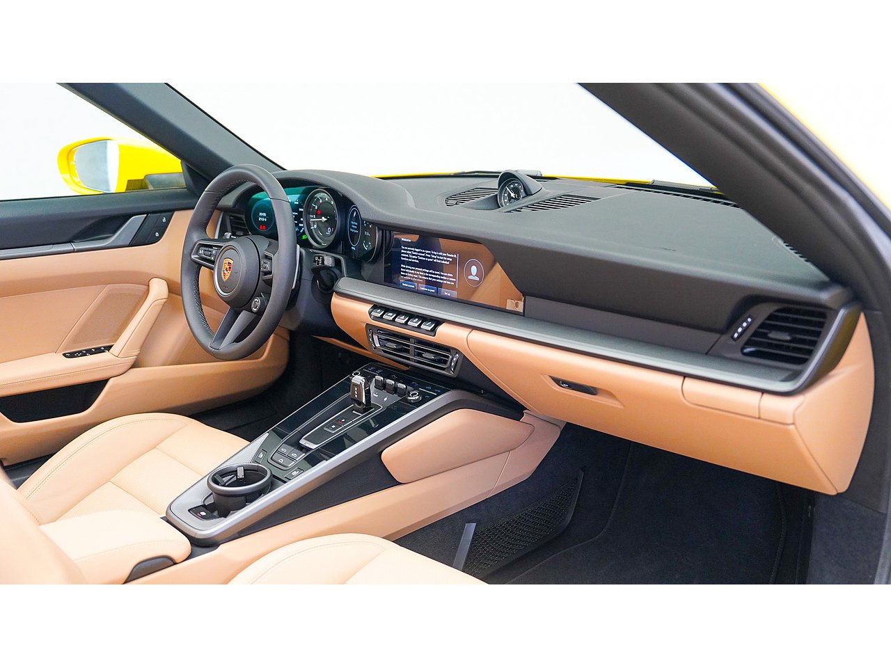 This 2024 Porsche 911 Cabriolet delivers timeless open-top performance paired with unmistakable Porsche design, finished in striking Racing Yellow with a contrasting brown convertible roof and a refined Beige interior.