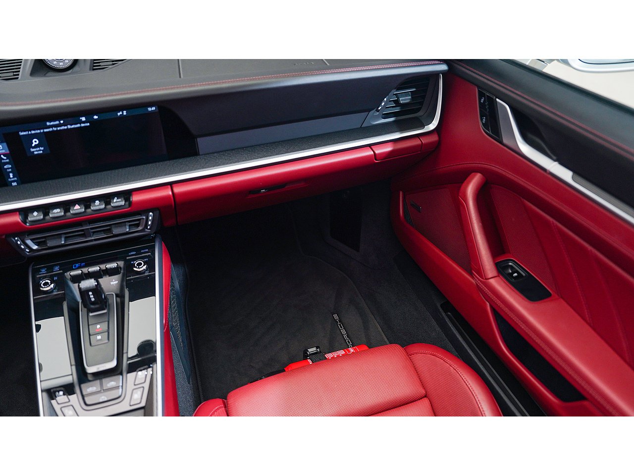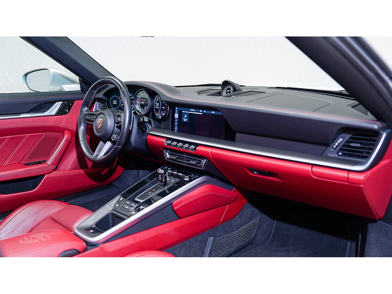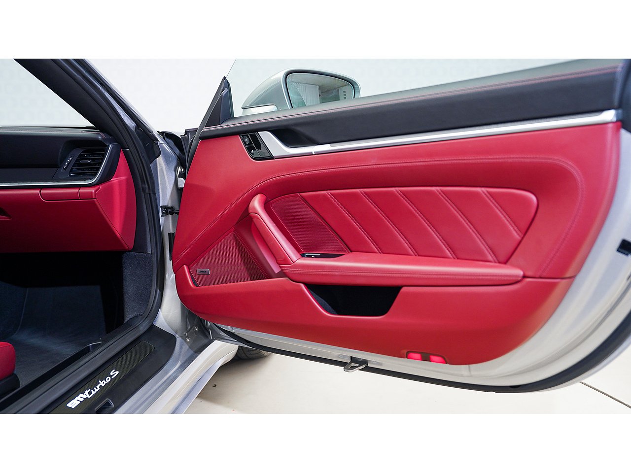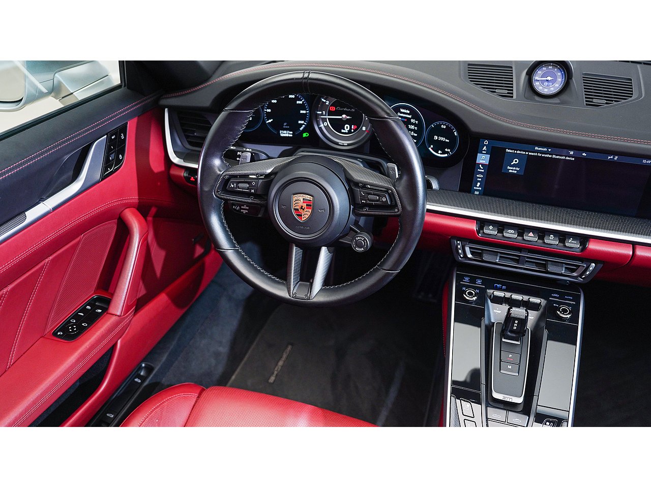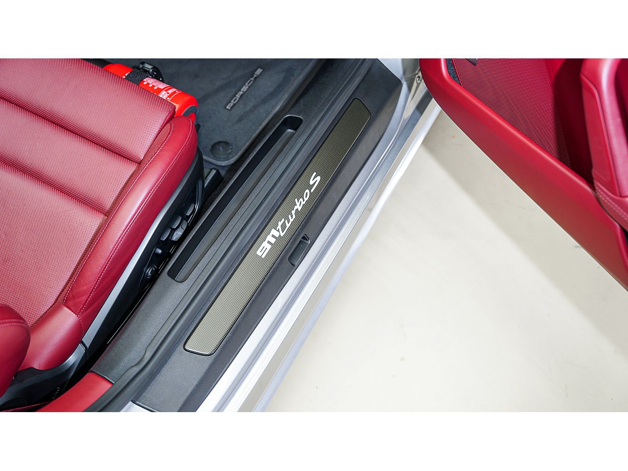 The exterior is defined by 20/21-inch Turbo S wheels, high-gloss black accents on the side intakes and rear logo, and a sport exhaust system with black tailpipes. Inside, carbon fiber trim and illuminated carbon fiber door-sill guards elevate the bespoke tailoring theme, complemented by adaptive 18-way sport seats plus in Bordeaux red belts. Comfort and technology blend seamlessly with ventilated and heated seats, a heated carbon-trimmed steering wheel, ambient lighting, and a BOSE Surround Sound System.
